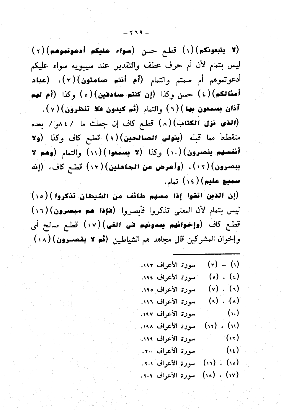 {لا يتبعونكم} قطع حسن {سواء عليكم أدعوتموهم} ليس بتمام لأن أم حرف عطف والتقدير عند سيبويه سواء عليكم أدعوتموهم أم صمتم والتمام {أم أنتم صامتون}، {عباد أمثالكم} حسن وكذا {إن كنتم صادقين} وكذا {أم لهم آذان يسمعون بها} والتمام {ثم كيدون فلا تنظرون}.