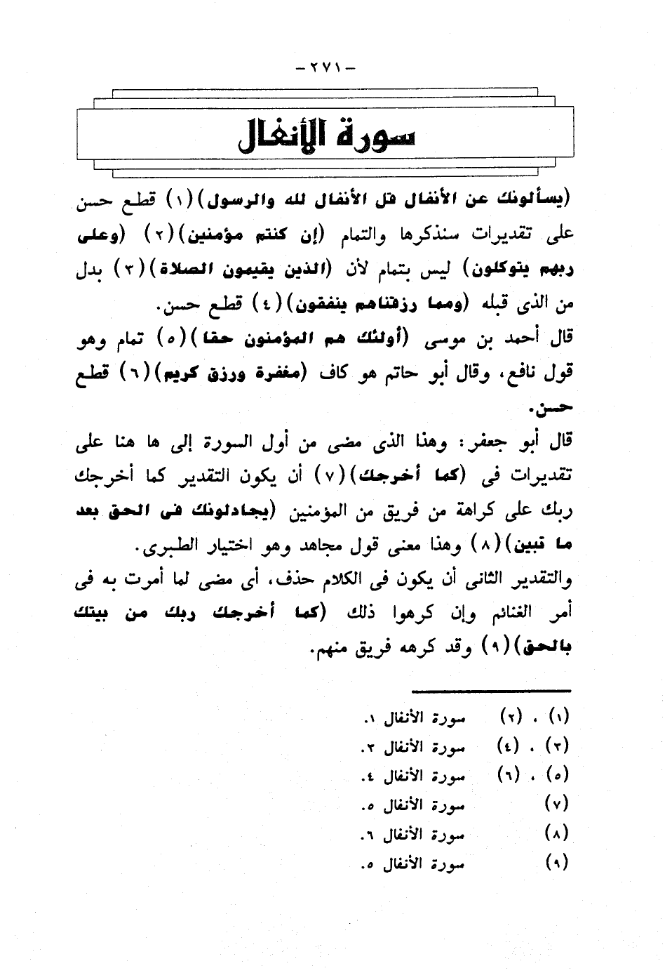 قال أبو جعفر: وهذا الذي مضى من أول السورة إلى هاهنا على تقديرات في {كما أخرجك} أن يكون التقدير كما أخرجك ربك على كراهة من فريق من المؤمنين {يجادلونك في الحق بعد ما تبين} وهذا معنى قول مجاهد وهو اختيار الطبري.
