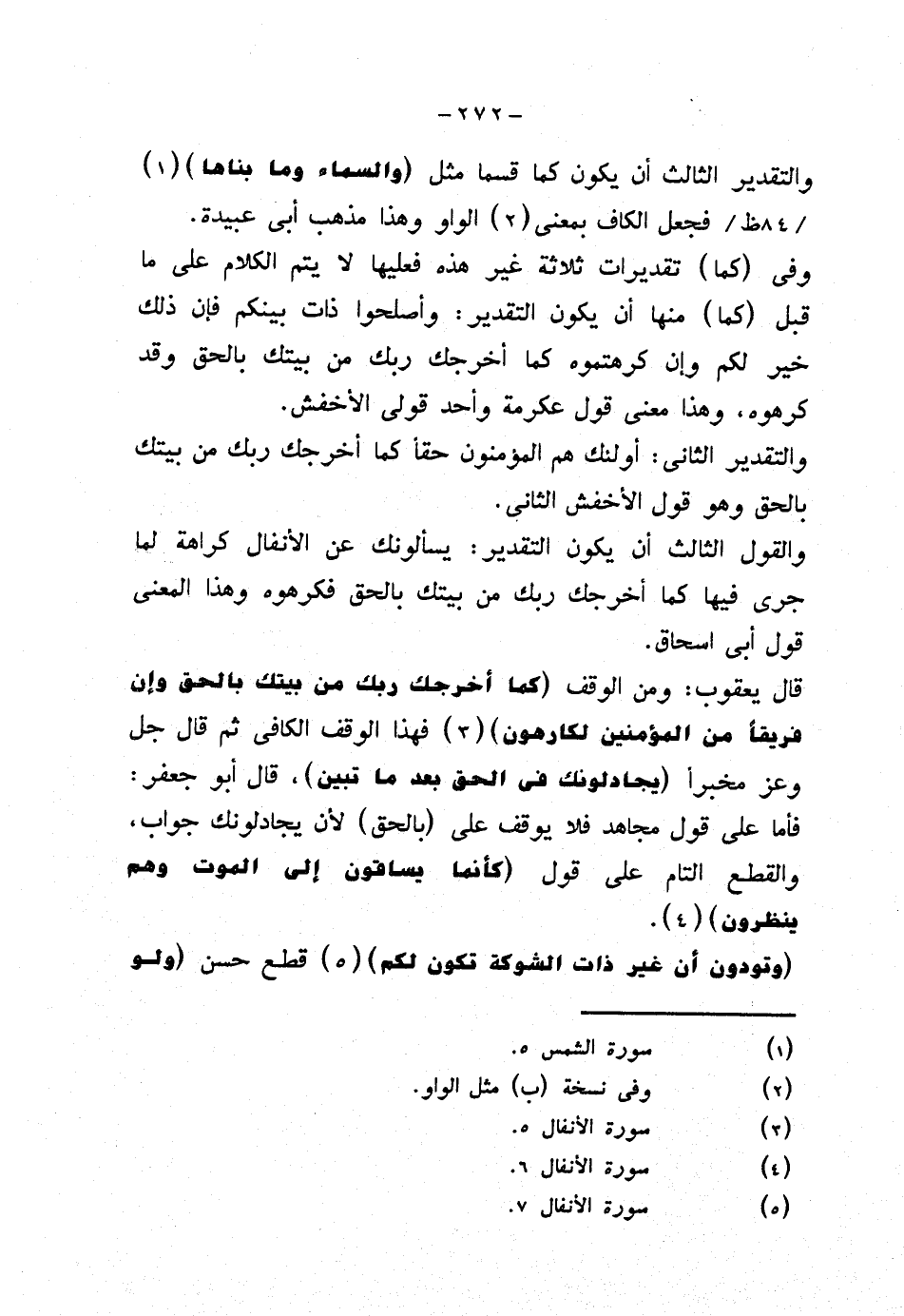 قال يعقوب: ومن الوقف {كما أخرجك ربك من بيتك بالحق وإن فريقًا من المؤمنين لكارهون} فهذا الوقف الكافي ثم قال جل وعز مخبرًا {يجادلونك في الحق بعد ما تبين}، قال أبو جعفر: فأما على قول مجاهد فلا يوقف على (بالحق) لأن يجادلونك جواب، والقطع التام على قول {كأنما يساقون إلى الموت وهم ينظرون}.
