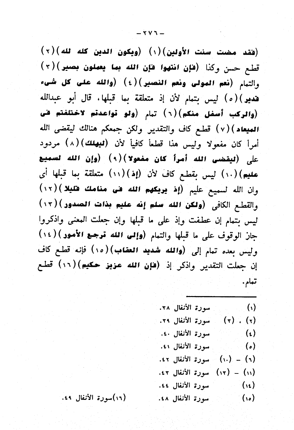 {فقد مضت سنت الأولين} {ويكون الدين كله لله} قطع حسن وكذا {فإن انتهوا فإن الله بما يعملون بصير} والتمام {نعم المولى ونعم النصير} {والله على كل شيء قدير} ليس بتمام لأن إذ متعلقة بما قبلها، قال أبو عبد الله {والركب أسفل منكم} تمام {ولو تواعدتم لاختلفتم في الميعاد} قطع كاف والتقدير ولكن جمعكم هنالك ليقضي الله أمرًا كان مفعولا وليس هذا قطعًا كافيًا لأن {ليهلك} مردود على {ليقضي الله أمرا كان مفعولا} {وإن الله لسميع عليم} ليس بقطع كاف لأن {إذ} متعلقة بما قبلها أي وأن الله لسميع عليم {إذ يريكهم الله في منامك قليلا} والقطع الكافي {ولكن الله سلم إنه عليم بذات الصدور} ليس بتمام إن عطفت وإذ على ما قبلها وإن جعلت المعنى واذكروا جاز الوقوف على ما قبلها والتمام {وإلى الله ترجع الأمور} وليس بعده تمام إلى {والله شديد العقاب} فإنه قطع كاف إن جعلت التقدير واذكر إذ {فإن الله عزيز حكيم} قطع تمام.