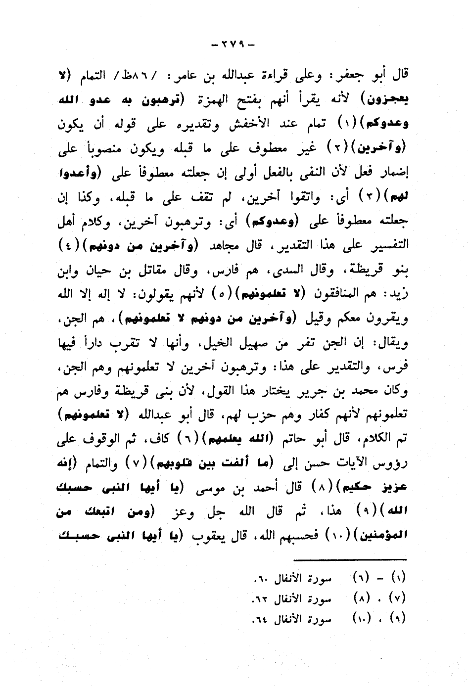 قال أبو جعفر: وعلى قراءة عبد الله بن عامر: التمام (لا يعجزون) لأنه يقرأ أنهم بفتح الهمزة {ترهبون به عدو الله وعدوكم} تمام عند الأخفش وتقديره على قوله أن يكون {وآخرين} غير معطوف على ما قبله ويكون منصوبًا على إضمار فعل لأن النفي بالفعل أولى إن جعلته معطوفا على {وأعدوا لهم} أي: واتقوا آخرين، لم تقف على ما قبله، وكذا إن جعلته معطوفًا على (وعدوكم) أي: وترهبون آخرين، وكلام أهل التفسير على هذا التقدير، قال مجاهد {وآخرين من دونهم} بنو قريظة، وقال السدي، هم فارس، وقال مقاتل بن حيان وابن زيد: هم المنافقون {لا تعلمونهم} لأنهم يقولون: لا إله إلا الله ويقرون معكم وقيل (وآخرين من دونهم لا تعلمونهم)، هم الجن، ويقال: إن الجن تفر من صهيل الخيل، وأنها لا تقرب دارًا فيها فرس، والتقدير على هذا: وترهبون آخرين لا تعلمونهم وهم الجن، وكان محمد بن جرير يختار هذا القول، لأن بني قريظة وفارس هم تعلمونهم لأنهم كفار وهم حزب لهم، قال أبو عبد الله (لا تعلمونهم) تم الكلام، قال أبو حاتم {الله يعلمهم} كاف، ثم الوقوف على رؤوس الآيات حسن إلى {ما ألفت بين قلوبهم} والتمام {إنه عزيز حكيم} قال أحمد بن موسى {يا أيها النبي حسبك الله} هذا، ثم قال الله جل وعز {ومن اتبعك من المؤمنين} فحسبهم الله، قال يعقوب {يا أيها النبي حسبك
