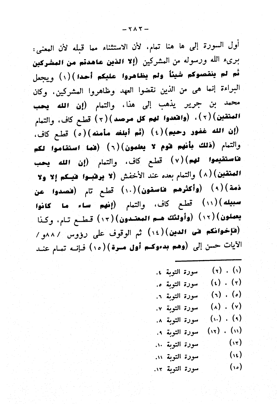 أول السورة إلى هاهنا تمام، لأن الاستثناء مما قبله لأن المعنى: برئ الله ورسوله من المشركين {إلا الذين عاهدتم من المشركين ثم لم ينقصوكم شيئًا ولم يظاهروا عليكم أحدا} ويجعل البراءة إنما هي من الذين نقضوا العهد وظاهروا المشركين، وكان محمد بن جرير يذهب إلى هذا، والتمام {إن الله يحب المتقين}، {واقعدوا لهم كل مرصد} قطع كاف، والتمام {إن الله غفور رحيم} {ثم أبلغه مأمنه} قطع كاف، والتمام {ذلك بأنهم قوم لا يعلمون} {فما استقاموا لكم فاستقيموا لهم} قطع كاف، والتمام {إن الله يحب المتقين} والتمام بعده عند الأخفش {لا يرقبوا فيكم إلا ولا ذمة} {وأكثرهم فاسقون} قطع تام {فصدوا عن سبيله} قطع كاف، والتمام {إنهم ساء ما كانوا يعملون} {وأولئك هم المعتدون} قطع تام، وكذا {فإخوانكم في الدين} ثم الوقوف على رؤوس الآيات حسن إلى {وهم بدءوكم أول مرة} فإنه تمام عند