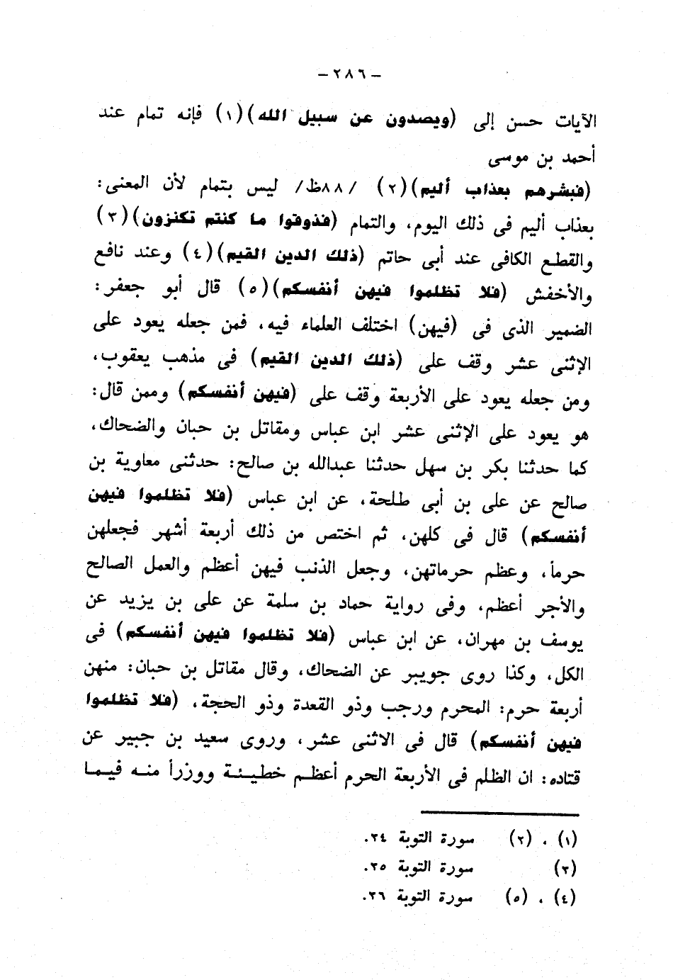 {فبشرهم بعذاب أليم} ليس بتمام لأن المعنى: بعذاب أليم في ذلك اليوم، والتمام {فذوقوا ما كنتم تكنزون} والقطع الكافي عند أبي حاتم {ذلك الدين القيم} وعند نافع والأخفش {فلا تظلموا فيهن أنفسكم} قال أبو جعفر: الضمير الذي في (فيهن) اختلف العلماء فيه، فمن جعله يعود على الاثنى عشر وقف على (ذلك الدين القيم) في مذهب يعقوب، ومن جعله يعود على الأربعة وقف على (فيهن أنفسكم) وممن قال: هو يعود على الاثنى عشر ابن عباس ومقاتل بن حبان والضحاك، كما حدثنا بكر بن سهل حدثنا عبد الله بن صالح: حدثن يمعاوية بن صالح عن علي بن أبي طلحة، عن ابن عباس (فلا تظلموا فيهن أنفسكم) قال في كلهن، ثم اختص من ذلك أربعة أشهر فجعلهن حرمًا، وعظم حرماتهن، وجعل الذنب فيهن أعظم والعمل الصالح والأجر أعظم، وفي رواية حماد بن سلمة عن علي بن يزيد عن يوسف بن مهران، عن ابن عباس (فلا تظلموا فيهن أنفسكم) في الكل، وكذا روى جويبر عن الضحاك، وقال مقاتل بن حبان: منهن أربعة حرم: المحرم ورجب وذو القعدة وذو الحجة، (فلا تظلموا فيهن أنفسكم) قال في الاثنى عشر، وروى سعيد بن جبير عن قتاده: إن الظلم في الأربعة الحرم أعظم خطيئة ووزرًا منه فيما