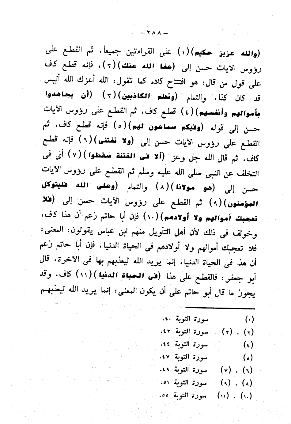 {والله عزيز حكيم} على القراءتين جميعًا، ثم القطع على رؤوس الآيات حسن إلى {عفا الله عنك}، فإنه قطع كاف على قول من قال: هو افتتاح كلام كما تقول: الله أعزك الله أليس قد كان كذا، والتمام {وتعلم الكاذبين} {أن يجاهدوا بأموالهم وأنفسهم} قطع كاف، ثم القطع على رؤوس الآيات حسن إلى قوله {وفيكم سماعون لهم} فإنهم قطع كاف، ثم القطع على رؤوس الآيات حسن إلى {ولا تفتني} فإنه قطع كاف، ثم قال الله جل وعز {ألا في الفتنة سقطوا} أي في التخلف عن النبي صلى الله عليه وسلم ثم القطع على رؤوس الآيات حسن إلى {هو مولانا} والتمام {وعلى الله فليتوكل المؤمنون} ثم القطع على رؤوس الآيات حسن إلى {فلا تعجبك أموالهم ولا أولادهم} فإن أبا حاتم زعم أن هذا كاف، وخولف في ذلك لأن أهل التأويل منهم ابن عباس يقولون: المعنى: فلا تعجبك أموالهم ولا أولادهم في الحياة الدنيا، فإن أبا حاتم زعم أن هذا في الحياة الدنيا، إنما يريد الله ليعذبهم بها في الآخرة، قال أبو جعفر: فالقطع على هذا {في الحياة الدنيا} كاف، وقد يجوز ما قال أبو حاتم أن يكون المعنى: إنما يريد الله ليعذبهم
