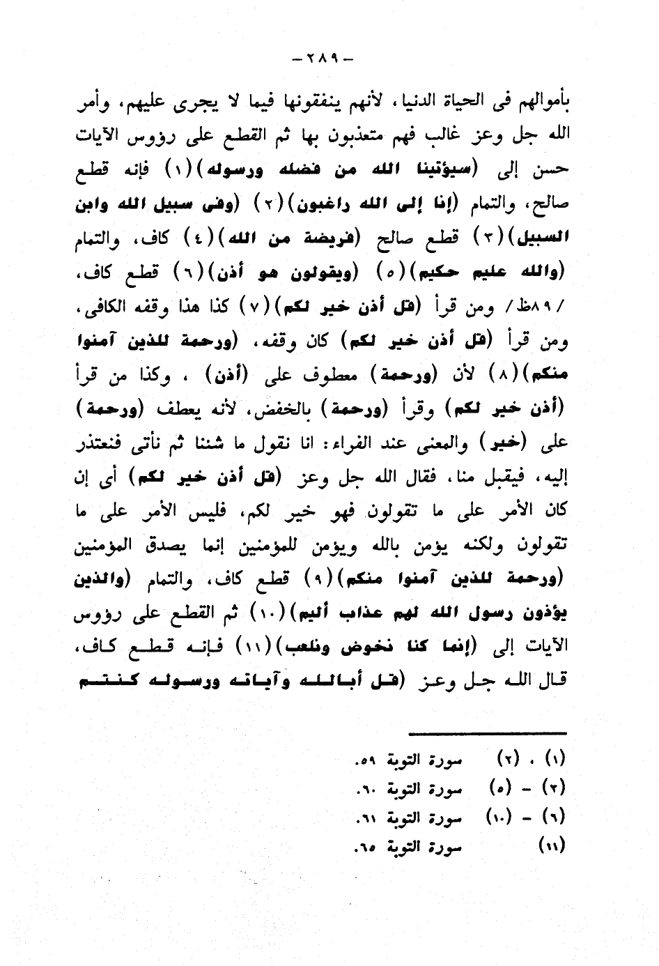 بأموالهم في الحياة الدنيا، لأنهم ينفقونها فيما لا يجري عليهم، وأمر الله جل وعز غالب فهم متعذبون بها ثم القطع على رؤوس الآيات حسن إلى {سيؤتينا الله من فضله ورسوله} فإنه قطع صالح، والتمام {إنا إلى الله راغبون} {وفي سبيل الله وابن السبيل} قطع صالح {فريضة من الله} كاف، والتمام {والله عليم حكيم} {ويقولون هو أذن} قطع كاف، ومن قرأ {قل أذن خير لكم} كذا هذا وقفه الكافي، ومن قرأ (قل أذن خير لكم) كان وقفه، {ورحمة للذين آمنوا منكم} لأن (ورحمة) معطوف على (أذن)، وكذا من قرأ (أذن خير لكم) وقرأ (ورحمة) بالخفض، لأنه يعطف (ورحمة) على (خير) والمعنى عند الفراء: أنا نقول ما شئنا ثم نأتي فنعتذر إليه، فيقبل منا، فقال الله جل وعز (قل أذن خير لكم) أي إن كان الأمر على ما تقولون فهو خير لكم، فليس الأمر على ما تقولون ولكنه يؤمن بالله ويؤمن للمؤمنين إنما يصدق المؤمنين {ورحمة للذين آمنوا منكم} قطع كاف، والتمام {والذين يؤذون رسول الله لهم عذاب أليم} ثم القطع على رؤوس الآيات إلى {إنما كنا نخوض ونلعب} فإنه قطع كاف، قال الله جل وعز {قل أبالله وآياته ورسوله كنتم