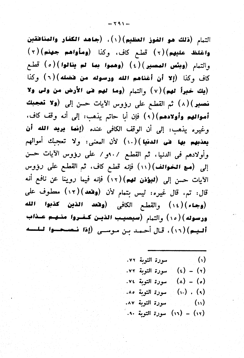 التمام {ذلك هو الفوز العظيم}، {جاهد الكفار والمنافقين واغلظ عليهم} قطع كاف، وكذا {ومأواهم جهنم} والتمام {وبئس المصير} {وهموا بما لم ينالوا} قطع كاف وكذا {إلا أن أغناهم الله ورسوله من فضله} وكذا {يك خيرًا لهم} والتمام {وما لهم في الأرض من ولي ولا نصير} ثم القطع على رؤوس الآيات حسن إلى {ولا تعجبك أموالهم وأولادهم} فإن أبا حاتم يذهب: إلى أنه وقف كاف، وغيره يذهب: إلى أن الوقف الكافي عنده {إنما يريد الله أن يعذبهم بها في الدنيا} لأن المعنى: ولا تعجبك أموالهم وأولادهم في الدنيا، ثم القطع على رؤوس الآيات حسن إلى {مع الخوالف} فإنه قطع كاف، ثم القطع على رؤوس الآيات حسن إلى {ليؤذن لهم} فإنه فيما روينا عن نافع أنه قال: تم، قال غيره: ليس بتمام لأن {وقعد} معطوف على {وجاء} والقطع الكافي {وقعد الذين كذبوا الله ورسوله} والتمام {سيصيب الذين كفروا منهم عذاب أليم}، قال أحمد بن موسى {إذا نصحوا لله