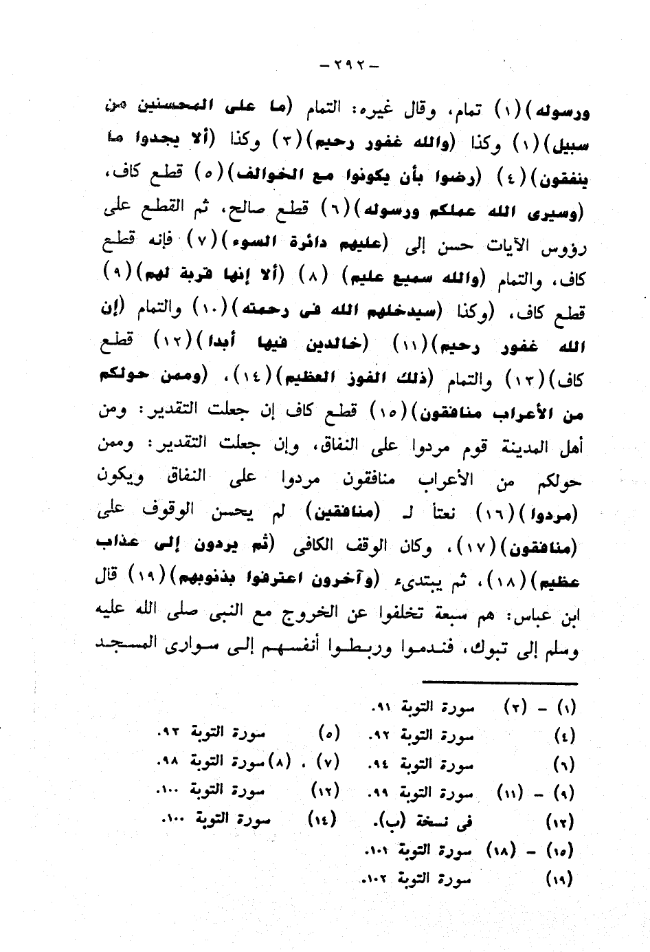ورسوله} تمام، وقال غيره: التمام {ما على المحسنين من سبيل} وكذا {والله غفور رحيم} وكذا {ألا يجدوا ما ينفقون} {رضوا بأن يكونوا مع الخوالف} قطع كاف، {وسيرى الله عملكم ورسوله} قطع صالح، ثم القطع على رؤوس الآيات حسن إلى {عليهم دائرة السوء} فإنه قطع كاف، والتمام {والله سميع عليم} {ألا إنها قربة لهم} قطع كاف، وكذا {سيدخلهم الله في رحمته} والتمام {إن الله غفور رحيم} {خالدين فيها أبدا} قطع كاف والتمام {ذلك الفوز العظيم}، {وممن حولكم من الأعراب منافقون} قطع كاف إن جعلت التقدير: ومن أهل المدينة قوم مردوا على النفاق، وإن جعلت التقدير: وممن حولكم من الأعراب منافقون مردوا على النفاق ويكون {مردوا} نعتًا لـ (منافقين) لم يحسن الوقوف على {منافقون}، وكان الوقف الكافي {ثم يردون إلى عذاب عظيم}، ثم يبتدئ {وآخرون اعترفوا بذنوبهم} قال ابن عباس: هم سبعة تخلفوا عن الخروج مع النبي صلى الله عليه وسلم إلى تبوك، فندموا وربطوا أنفسهم إلى سواري المسجد