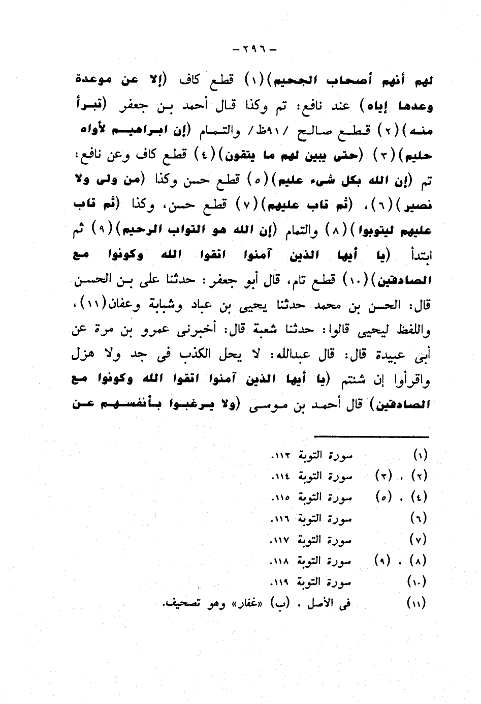 لهم أنهم أصحاب الجحيم} قطع كاف {إلا عن موعدة وعدها إياه} عند نافع: تم وكذا قال أحمد بن جعفر {تبرأ منه} قطع صالح والتمام {إن إبراهيم لأواه حليم} {حتى يبين لهم ما يتقون} قطع كاف وعن نافع: تم {إن الله بكل شيء عليم} قطع حسن وكذا {من ولى ولا نصير}، {ثم تاب عليهم} قطع حسن، وكذا {ثم تاب عليهم ليتوبوا} والتمام {إن الله هو التواب الرحيم} ثم ابتدأ {يا أيها الذين آمنوا اتقوا الله وكونوا مع الصادقين} قطع تام، قال أبو جعفر: حدثنا علي بن الحسن قال: الحسن بن محمد حدثنا يحيى بن عباد وشبابة وعفان، واللفظ ليحيى قالوا: حدثنا شعبة قال: أخبرني عمرو بن مرة عن أبي عبيدة قال: قال عبد الله: لا يحل الكذب في جد ولا هزل واقرأوا إن شئتم (يا أيها الذين آمنوا اتقوا الله وكونوا مع الصادقين) قال أحمد بن موسى (ولا يرغبوا بأنفسهم عن