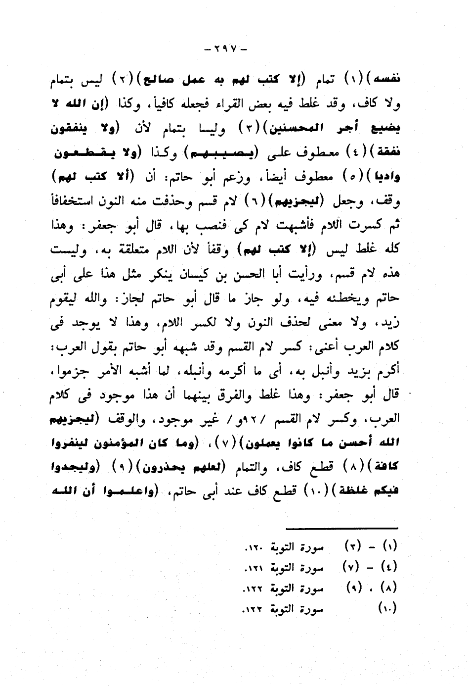 نفسه) تمام {إلا كتب لهم به عمل صالح} ليس بتمام ولا كاف، وقد غلط فيه بعض القراء فجعله كافيًا، وكذا {إن الله لا يضيع أجر المحسنين} وليسا بتمام لأن {ولا ينفقون نفقة} معطوف على (يصيبهم) وكذا {ولا يقطعون واديا} معطوف أيضًا، وزعم أبو حاتم: أن (ألا كتب لهم) وقف، وجعل {ليجزيهم} لام قسم وحذفت منه النون استخفافًا ثم كسرت اللام فأشبهت لام كي فنصب بها، قال أبو جعفر: وهذا كله غلط ليس (إلا كتب لهم) وقفًا لأن اللام متعلقة به، وليست هذه لام قسم، ورأيت أبا الحسن بن كيسان ينكر مثل هذا على أبي حاتم ويخطئه فيه، ولو جاز ما قال أبو حاتم لجاز: والله ليقوم زيد، ولا معنى لحذف النون ولا لكسر اللام، وهذا لا يوجد في كلام العرب أعني: كسر لام القسم وقد شبهه أبو حاتم بقول العرب: أكرم بزيد وأنبل به، أي ما أكرمه وأنبله، لما أشبه الأمر جزموا، قال أبو جعفر: وهذا غلط والفرق بينهما أن هذا موجود في كلام العرب، وكسر لام القسم غير موجود، والوقف {ليجزيهم الله أحسن ما كانوا يعملون}، {وما كان المؤمنون لينفروا كافة} قطع كاف، والتمام {لعلهم يحذرون} {وليجدوا فيكم غلظة} قطع كاف عند أبي حاتم، {واعلموا أن الله