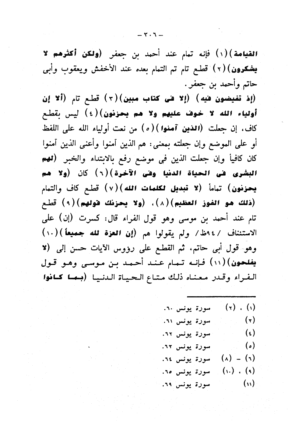 {إذ تفيضون فيه} {إلا في كتاب مبين} قطع تام {ألا إن أولياء الله لا خوف عليهم ولا هم يحزنون} ليس بقطع كاف، إن جعلت {الذين آمنوا} من نعت أولياء الله على اللفظ أو على الموضع وإن جعلته بمعنى: هم الذين آمنوا وأعني الذين آمنوا كان كافيًا وإن جعلت الذين في موضع رفع بالابتداء والخبر {لهم البشرى في الحياة الدنيا وفي الآخرة} كان {ولا هم يحزنون} تمامًا {لا تبديل لكلمات الله} قطع كاف والتمام {ذلك هو الفوز العظيم}، {ولا يحزنك قولهم} قطع تام عند أحمد بن موسى وهو قول الفراء قال: كسرت (إن) على الاستئناف ولم يقولوا هم {إن العزة لله جميعًا} وهو قول أبي حاتم، ثم القطع على رؤوس الآيات حسن إلى {لا يفلحون} فإنه تمام عند أحمد بن موسى وهو قول الفراء وقدر معناه ذلك متاع الحياة الدنيا {بما كانوا