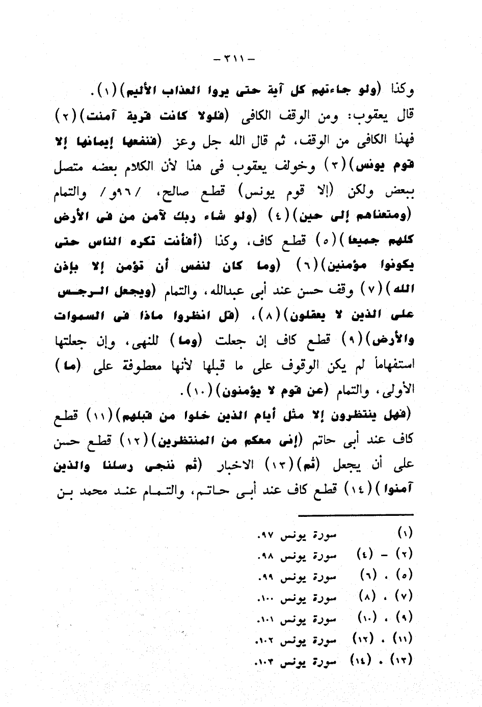 قال يعقوب: ومن الوقف الكافي {فلولا كانت قرية آمنت} فهاذ الكافي من الوقف، ثم قال الله جل وعز {فنفعها إيمانها إلا قوم يونس} وخولف يعقوب في هذا لأن الكلام بعضه متصل ببعض ولكن (إلا قوم يونس) قطع صالح، والتمام {ومعناهم إلى حين} {ولو شاء ربك لآمن من في الأرض كلهم جميعا} قطع كاف، وكذا {أفأنت تكره الناس حتى يكونوا مؤمنين} {وما كان لنفس أن تؤمن إلا بإذن الله} وقف حسن عند أبي عبد الله، والتمام {ويجعل الرجس على الذين لا يعقلون}، {قل انظروا ماذا في السموات والأرض} قطع كاف إن جعلت (وما) للنهي، وإن جعلتها استفهامًا لم يكن الوقوف على ما قبلها لأنها معطوفة على (ما) الأولى، والتمام {عن قوم لا يؤمنون}.