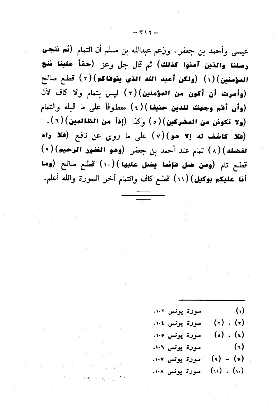 عيسى وأحمد بن جعفر، وزعم عبد الله بن مسلم أن التمام (ثم ننجي رسلنا والذين آمنوا كذلك) ثم قال جل وعز {حقًا علينا ننج المؤمنين} {ولكن أعبد الله الذي يتوفاكم} قطع صالح {وأمرت أن أكون من المؤمنين} ليس بتمام ولا كاف لأن {وأن أقم وجهك للدين حنيفا} معطوفًا على ما قبله والتمام {ولا تكونن من المشركين} وكذا {إذًا من الظالمين}. {فلا كاشف له إلا هو} على ما روى عن نافع {فلا راد لفضله} تمام عند أحمد بن جعفر {وهو الغفور الرحيم} قطع تام {ومن ضل فإنما يضل عليها} قطع صالح {وما أنا عليكم بوكيل} قطع كاف والتمام آخر السورة والله أعلم.
