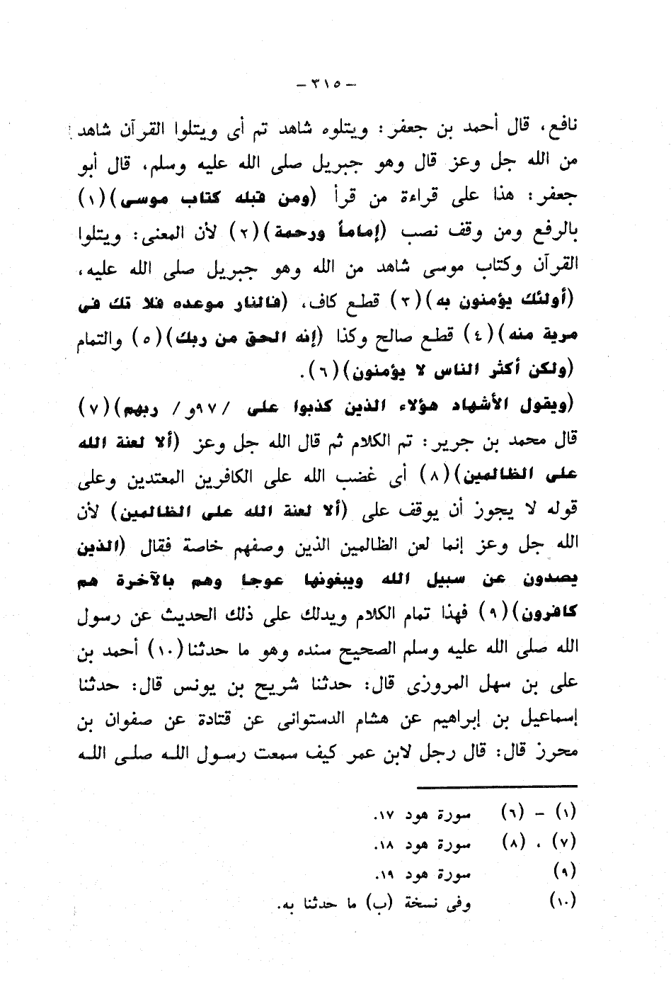 {ويقول الأشهاد هؤلاء الذين كذبوا على ربهم} قال محمد بن جرير: تم الكلام ثم قال الله جل وعز {ألا لعنة الله على الظالمين} أي غضب الله على الكافرين المعتدين وعلى قوله لا يجوز أن يقول على (ألا لعنة الله على الظالمين) لأن الله جل وعز إنما لعن الظالمين الذين وصفهم خاصة فقال {الذين يصدون عن سبيل الله ويبغونها عوجا وهم بالآخرة هم كافرون} فهذا تمام الكلام ويدلك على ذلك الحديث عن رسول الله صلى الله عليه وسلم الصحيح سنده وهو ما حدثنا أحمد بن علي بن سهل المروزي قال: حدثنا شريح بن يونس قال: حدثنا إسماعيل بن إبراهيم عن هشام الدستواني عن قتادة عن صفوان بن محرز قال: قال رجل لابن عمر كيف سمعت رسول الله صلى الله