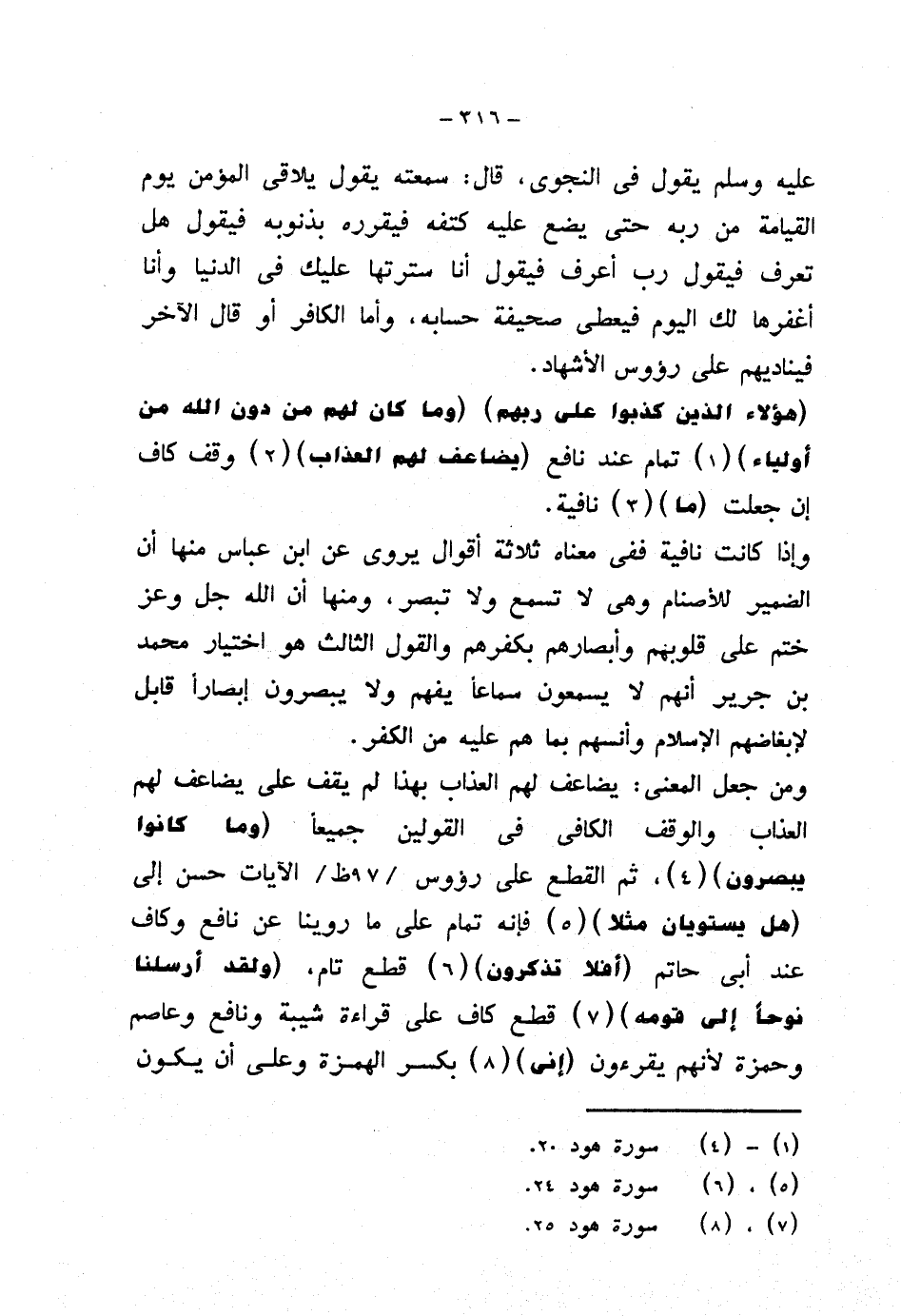 ومن جعل المعنى: يضاعف لهم العذاب بهذا لم يقف على يضاعف لهم العذاب والوقف الكافي في القولين جميعًا {وما كانوا يبصرون}، ثم القطع على رؤوس الآيات حسن إلى {هل يستويان مثلا} فإنه تمام على ما روينا عن نافع وكاف عند أبي حاتم {أفلا تذكرون} قطع تام، {ولقد أرسلنا نوحًا إلى قومه} قطع كاف على قراءة شيبة ونافع وعاصم وحمزة لأنهم يقرءون {إني} بكسر الهمزة وعلى أن يكون