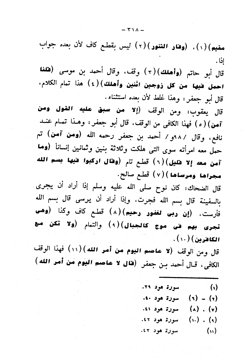 قال يعقوب: ومن الوقف {إلا من سبق عليه القول ومن آمن} فهذا الكافي من الوقف، قال أبو جعفر: وهذا تمام عند نافع، وقال أحمد بن جعفر رحمه الله (ومن آمن) تم حمل معه امرأته سوى التي هلكت وثلاثة بنين وثمانين إنسانًا {وما آمن معه إلا قليل} قطع تام {وقال اركبوا فيها بسم الله مجراها ومرساها} قطع صالح.