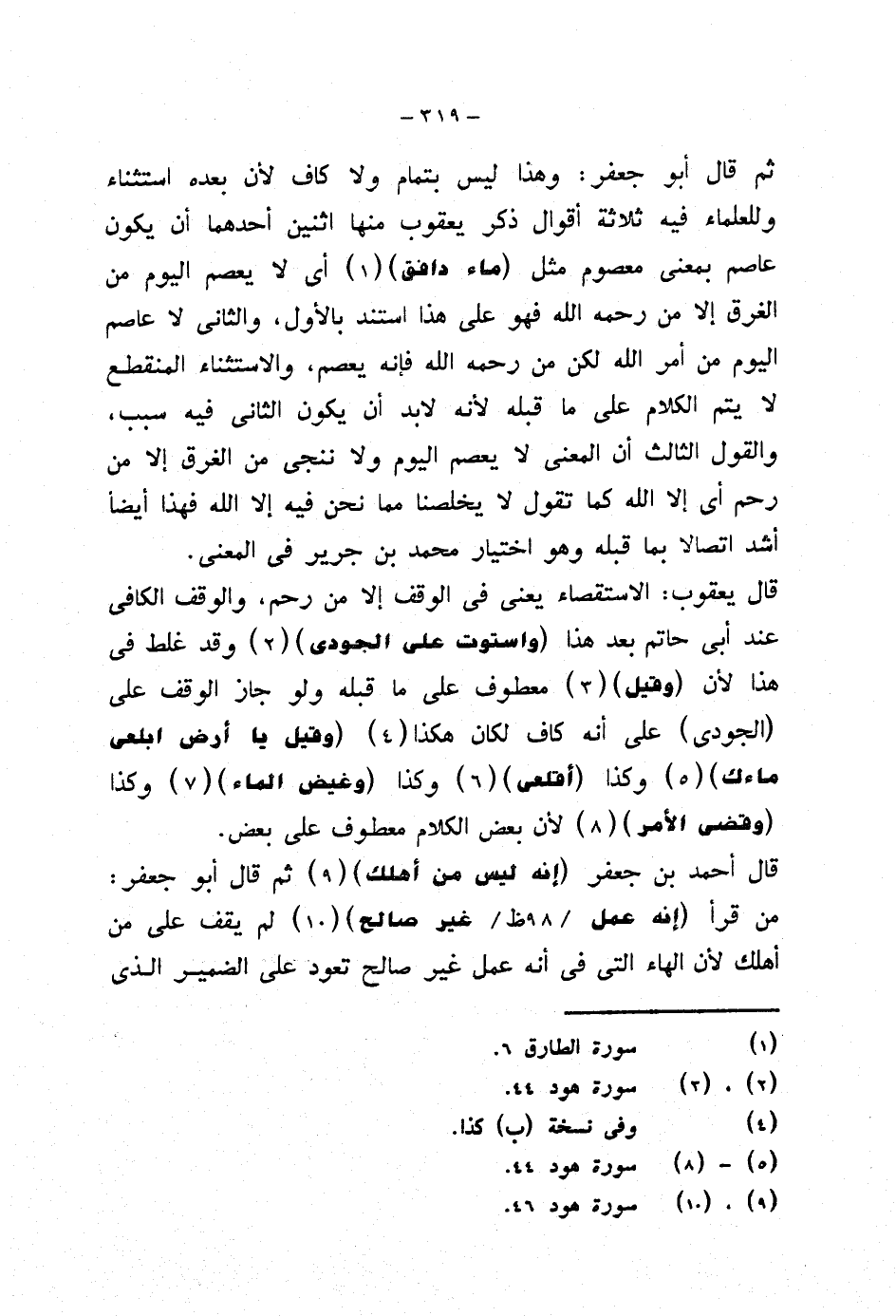 قال يعقوب: الاستقصاء يعني في الوقف إلا من رحم، والوقف الكافي عند أبي حاتم بعد هذا {واستوت على الجودي} وقد غلط في هذا لأن {وقيل} معطوف على ما قبله ولو جاز الوقف على (الجودي) على أنه كاف لكان هكذا {وقيل يا أرض ابلعي ماءك} وكذا {أقلعي} وكذا {وغيض الماء} وكذا {وقضى الأمر} لأن بعض الكلام معطوف على بعض.