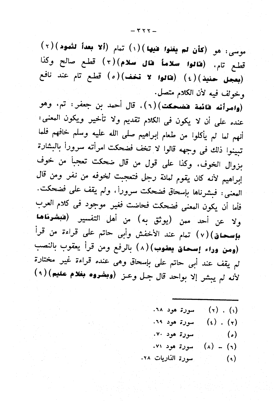 {وامرأته قائمة فضحكت}، قال أحمد بن جعفر: تم، وهو عنده على أن لا يكون في الكلام تقديم ولا تأخير ويكون المعنى: أنهم لما لم يأكلوا من طعام إبراهيم صلى الله عليه وسلم خافهم فلما تبينوا ذلك في وجهه قالوا لا تخف فضحكت امرأته سرورًا بالبشارة بزوال الخوف، وكذا على قول من قال ضحكت تعجبًا من خوف إبراهيم لأنه كان يقوم لمائة رجل فتعجبت لخوفه من نفر ومن قال المعنى: فبشرناها بإسحاق فضحكت سرورًا، ولم يقف على فضحكت. فأما أن يكون المعنى فضحكت فحاضت فغير موجود في كلام العرب ولا عن أحد ممن (يوثق به) من أهل التفسير {فبشرناها بإسحاق} تمام عند الأخفش وأبي حاتم على قراءة من قرأ {ومن وراء إسحاق يعقوب} بالرفع ومن قرأ يعقوب بالنصب لم يقف عند أبي حاتم على بإسحاق وهي عنده قراءة غير مختارة لأنه لم يبشر إلا بواحد قال جل وعز {وبشروه بغلام عليم}