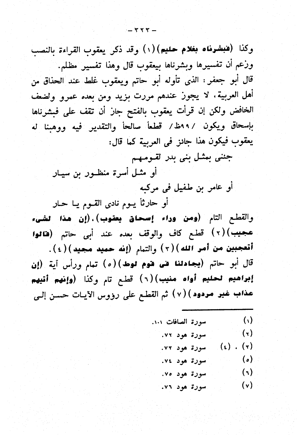 قال أبو حاتم {يجادلنا في قوم لوط} تمام ورأس آية {إن إبراهيم لحليم أواه منيب} قطع تام وكذا {وإنهم أتيهم عذاب غير مردود} ثم القطع على رؤوس الآيات حسن إلى