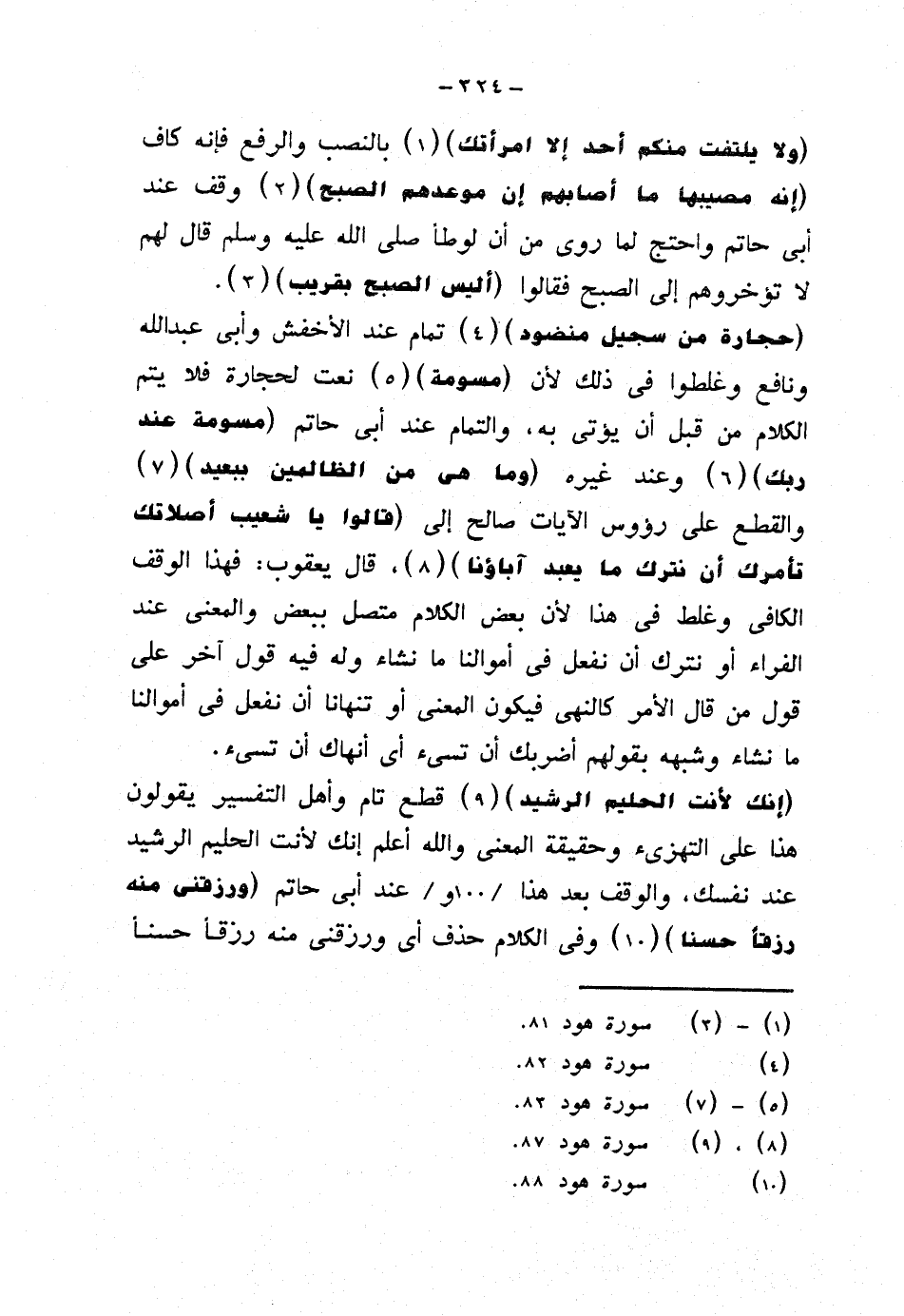 {حجارة من سجيل منضود} تمام عند الأخفش وأبي عبد الله ونافع وغلطوا في ذلك لأن {مسومة} نعت لحجارة فلا يتم الكلام من قبل أن يؤتي به، والتمام عند أبي حاتم {مسومة عند ربك} وعند غيره {وما هي من الظالمين ببعيد} والقطع على رؤوس الآيات صالح إلى {قالوا يا شعيب أصلاتك تأمرك أن نترك ما يعبد آباؤنا}، قال يعقوب: فهذا الوقف الكافي وغلط في هذا لأن بعض الكلام متصل ببعض والمعنى عند الفراء أو نترك أن نفعل في أموالنا ما نشاء وله فيه قول آخر على قول من قال الأمر كالنهي فيكون المعنى أو تنهانا أن نفعل في أموالنا ما نشاء وشبهه بقولهم أضربك أن تسيء أي أنهاك أن تسيء.