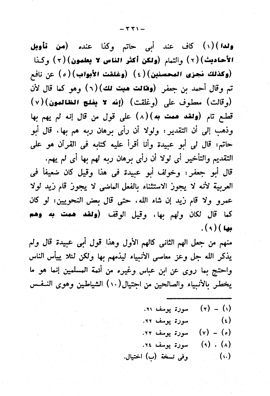 قال أبو جعفر: وخولف أبو عبيدة في هذا وقيل كان ضعيفًا في العربية لأنه لا يجوز الاستثناء بالفعل الماضي لا يجوز قام زيد لولا عمرو ولا قام زيد إن شاء الله، حتى قال بعض النحويين: لو كان كما قال لكان ولهم بها، وقيل الوقف {ولقد همت به وهم بها}.