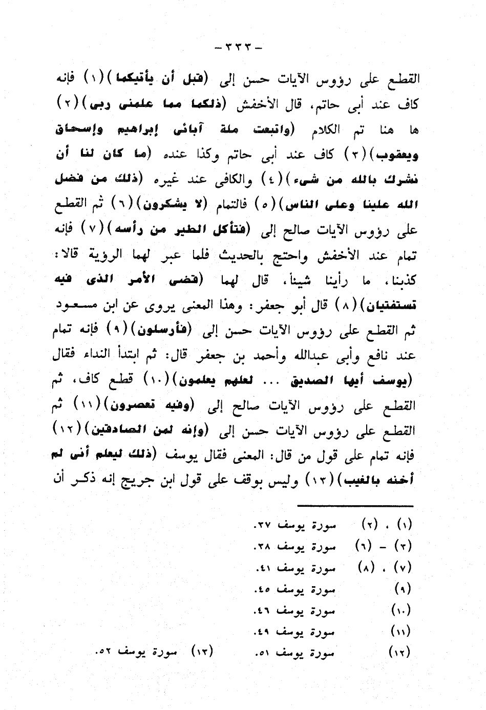القطع على رؤوس الآيات حسن إلى {قبل أن يأتيكما} فإنه كاف عند أبي حاتم، قال الأخفش {ذلكما مما علمني ربي} هاهنا تم الكلام {واتبعت ملة آبائي إبراهيم وإسحاق ويعقوب} كاف عند أبي حاتم وكذا عنده {ما كان لنا أن نشرك بالله من شيء} والكافي عند غيره {ذلك من فضل الله علينا وعلى الناس} فالتمام {لا يشكرون} ثم القطع على رؤوس الآيات صالح إلى {فتأكل الطير من رأسه} فإنه تمام عند الأخفش واحتج بالحديث فلما عبر لهما الرؤية قالا: كذبنا، ما رأينا شيئًا، قال لهما {قضى الأمر الذي فيه تستفيتان} قال أبو جعفر: وهذا المعنى يروى عن ابن مسعود ثم القطع على رؤوس الآيات حسن إلى {فأرسلون} فإنه تمام عند نافع وأبي عبد الله وأحمد بن جعفر قال: ثم ابتدأ النداء فقال {يوسف أيها الصديق ... لعلهم يعلمون} قطع كاف، ثم القطع على رؤوس الآيات صالح إلى {وفيه تعصرون} ثم القطع على رؤوس الآيات حسن إلى {وإنه لمن الصادقين} فإنه تمام على قول من قال: المعنى فقال يوسف {ذلك ليعلم أنى لم أخنه بالغيب} وليس بوقف على قول ابن جريج إنه ذكر أن