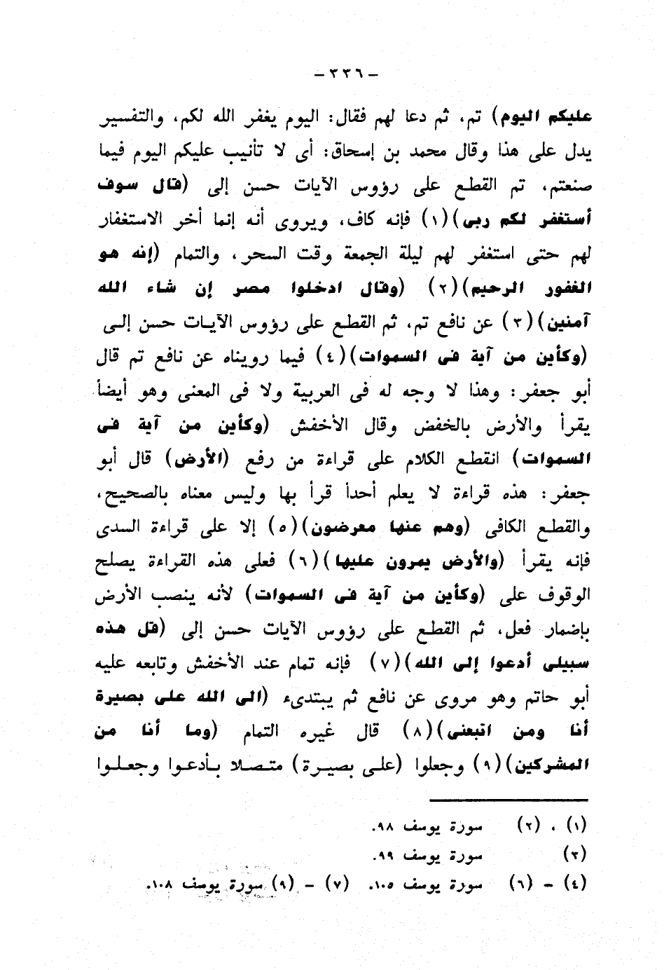 عليكم اليوم} تم، ثم دعا لهم فقال: اليوم يغفر الله لكم، والتفسير يدل على هذا وقال محمد بن إسحاق: أي لا تأنيب عليكم اليوم فيما صنعتم، تم القطع على رؤوس الآيات حسن إلى {قال سوف أستغفر لكم ربي} فإنه كاف، ويروى أنه إنما أخر الاستغفار لهم حتى استغفر لهم ليلة الجمعة وقت السحر، والتمام {إنه هو الغفور الرحيم} {وقال ادخلوا مصر إن شاء الله آمنين} عن نافع تم، ثم القطع على رؤوس الآيات حسن إلى {وكأين من آية في السموات} فيما رويناه عن نافع تم قال أبو جعفر: وهذا لا وجه له في العربية ولا في المعنى وهو أيضًا يقرأ والأرض بالخفض وقال الأخفش (وكأين من آية في السموات) انقطع الكلام على قراءة من رفع (الأرض) قال أبو جعفر: هذه قراءة لا يعلم أحدًا قرأ بها وليس معناه بالصحيح، والقطع الكافي {وهم عنها معرضون} إلا على قراءة السدي فإنه يقرأ {والأرض يمرون عليها} فعلى هذه القراءة يصلح الوقوف على {وكأين من آية في السموات} لأنه ينصب الأرض بإضمار فعل، ثم القطع على رؤوس الآيات حسن إلى {قل هذه سبيلي ادعوا إلى الله} فإنه تمام عند الأخفش وتابعه عليه أبو حاتم وهو مروى عن نافع ثم يبتدئ {إلى الله على بصيرة أنا ومن اتبعني} قال غيره التمام {وما أنا من المشركين} وجعلوا (على بصيرة) متصلا بأدعوا وجعلوا