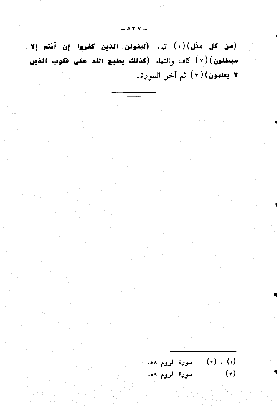{من كل مثل} تم، {ليقولن الذين كفروا إن أنتم إلا مبطلون} كاف والتمام {كذلك يطبع الله على قلوب الذين لا يعلمون} ثم آخر السورة.