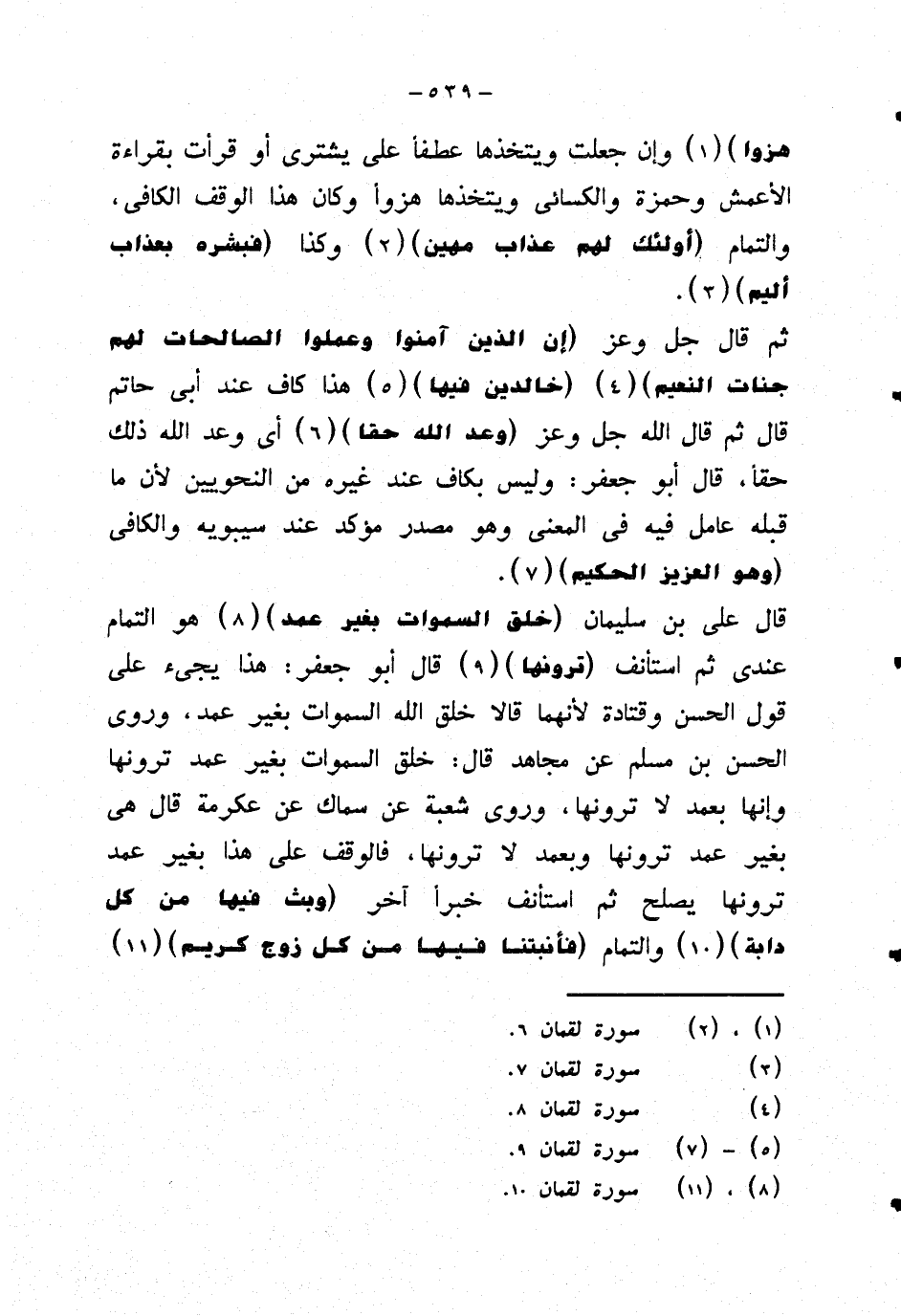 قال علي بن سليمان {خلق السموات بغير عمد} هو التمام عندي ثم استأنف {ترونها} قال أبو جعفر: هذا يجيء على قول الحسن وقتادة لأنهما قالا خلق الله السموات بغير عمد، وروى الحسن بن مسلم عن مجاهد قال: خلق السموات بغير عمد ترونها وإنها بعمد لا ترونها، وروى شعبة عن سمالك عن عكرمة قال هي بغير عمد ترونها وبعمد لا ترونها، فالوقف على هذا بغير عمد ترونها يصلح ثم استأنف خبرا آخر {وبث فيها من كل دابة} والتمام {فأنبتنا فيها من كل زوج كريم}.