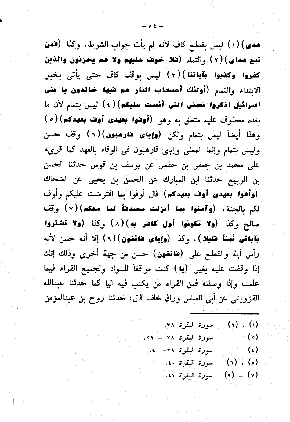 هدى} ليس بقطع كاف لأنه لم يأت جواب الشرط، وكذا {فمن تبع هداي} والتمام {فلا خوف عليهم ولا هم يحزنون والذين كفروا وكذبوا بآياتنا} ليس بوقف كاف حتى يأتي بخبر الابتداء والتمام {أولئك أصحاب النار هم فيها خالدون يا بني إسرائيل اذكروا نعمتي التي أنعمت عليكم} ليس بتمام لأن ما بعده معطوف عليه متعلق به وهو {أوفوا بعهدي أوف بعهدكم} وهذا أيضًا ليس بتمام ولكن {وإياي فارهبون} وقف حسن وليس بتمام وإنما المعنى وإياي فارهبون في الوفاء بالعهد كما قرئ على محمد بن جعفر بن حفص عن يوسف بن قوس حدثنا الحسن بن الربيع حدثنا ابن المبارك عن الحسن بن يحيى عن الضحاك (وأوفوا بعهدي أوف بعهدكم) قال أوفوا بما افترضت عليكم وأوف لكم بالجنة، {وآمنوا بما أنزلت مصدقًا لما معكم} وقف صالح وكذا {ولا تكونوا أول كافر به} وكذا {ولا تشتروا بآياتي ثمنًا قليلا}، وكذا {وإياي فاتقون} إلا أنه حسن لأنه رأس آية والقطع على (فاتقون) حسن من جهة أخرى وذلك إنك إذا وقفت عليه بغير (يا) كنت مواقفًا للسواد ولجميع القراء فيما علمت وإذا وصلته فمن القراء من يكتب فيه اليا كما حدثنا عبد الله القزويني عن أبي العباس وراق خلف قال: حدثنا روح بن عبد المؤمن