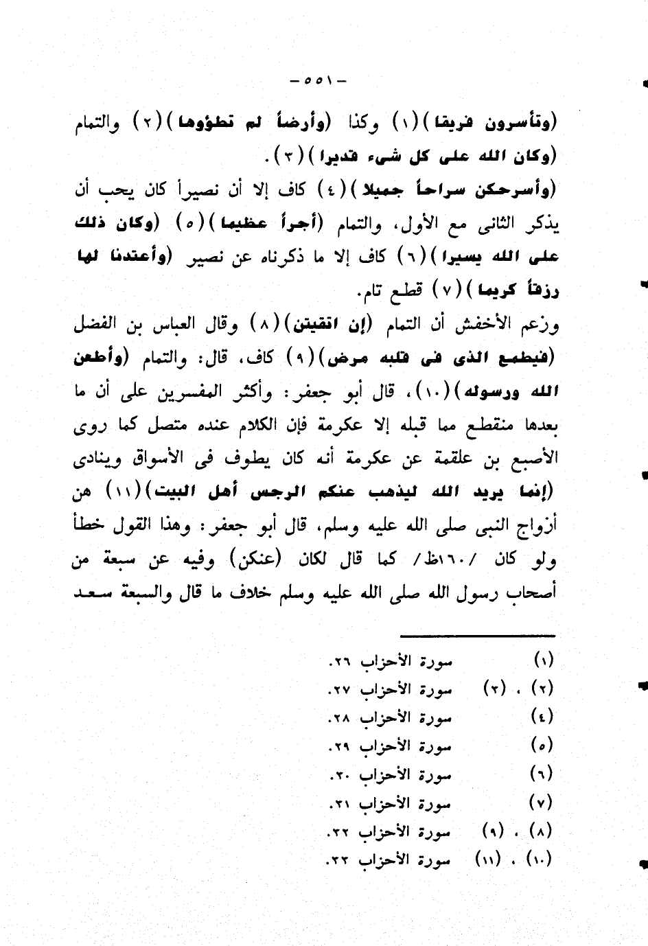 وزعم الأخفش أن التمام {إن اتقيتن} وقال العباس بن الفضل {فيطمع الذي في قلبه مرض} كاف، قال: والتمام {وأطعن الله ورسوله}، قال أبو جعفر: وأكثر المفسرين على أن ما بعدها منقطع مما قبله إلا عكرمة فإن الكلام عنده متصل كما روى الأصبع بن علقمة عن عكرمة أنه كان يطوف في الأسواق وينادي {إنما يريد الله ليذهب عنكم الرجس أهل البيت} هن أزواج النبي صلى الله عليه وسلم، قال أبو جعفر: وهذا القول خطأ ولو كان كما قال لكان {عنكن} وفيه عن سبعة من أصحاب رسول الله صلى الله عليه وسلم خلاف ما قال والسبعة سعد