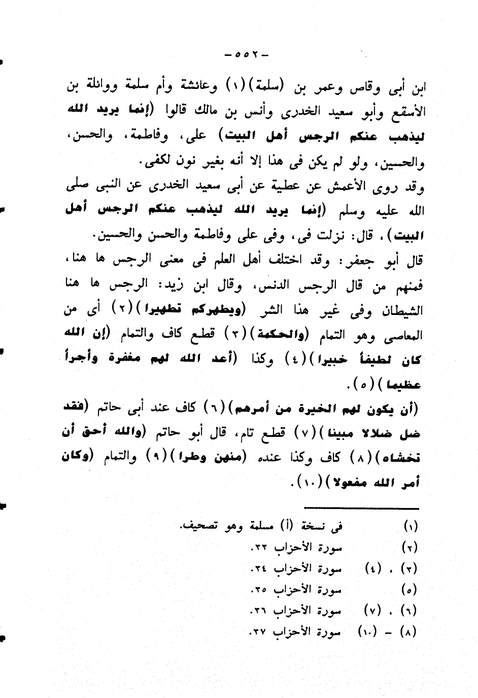 ابن أبي وقاص وعمر بن (سلمة) وعائشة وأم سلمة ووائلة بن الأسقع وأبو سعيد الخدري وأنس بن مالك قالوا {إنما يريد الله ليذهب عنكم الرجس أهل البيت} على، وفاطمة، والحسن، والحسين، ولو لم يكن في هذا إلا أنه بغير نون لكفى.