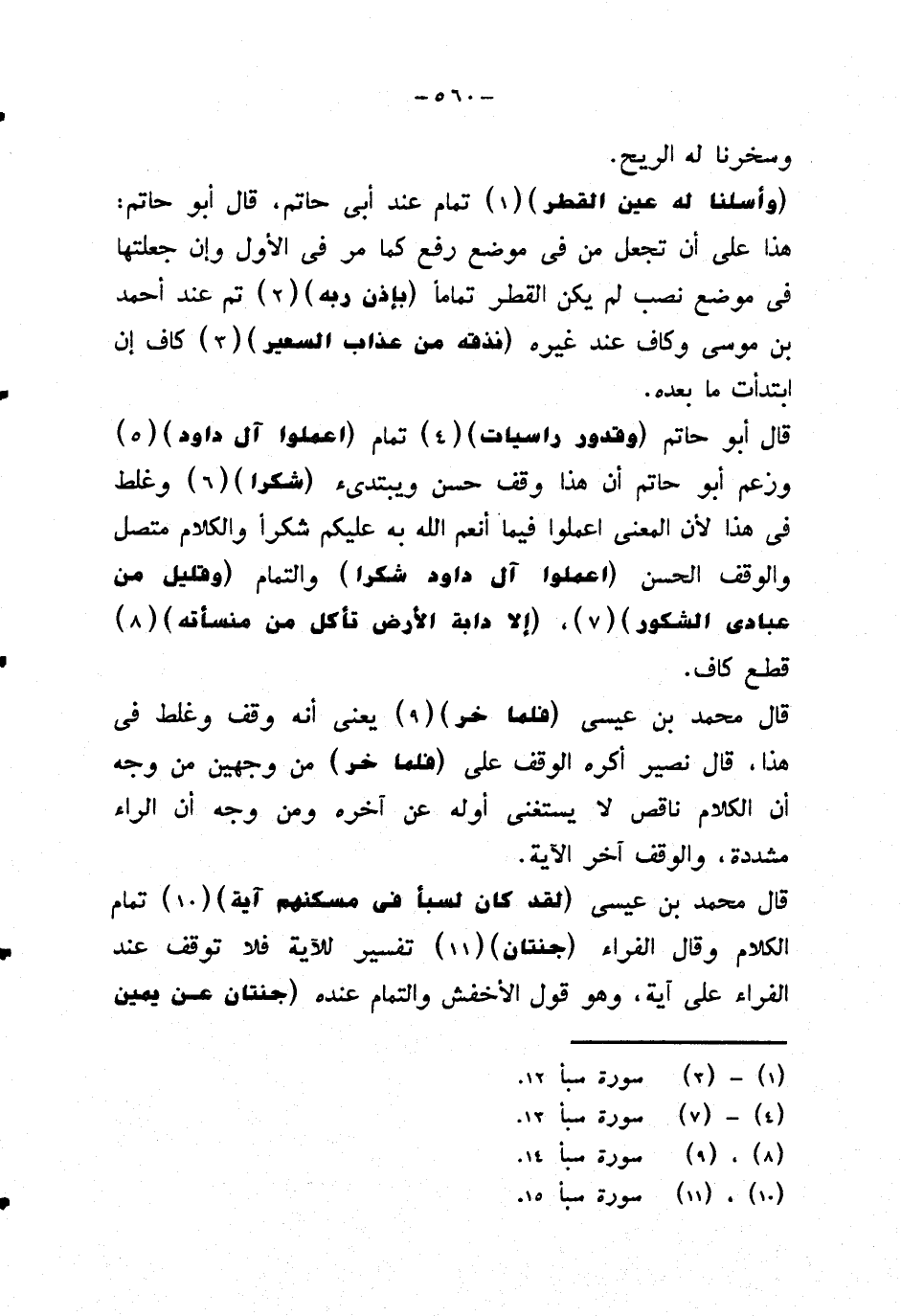 {وأسلنا له عين القطر} تمام عند ابي حاتم، قال أبو حاتم: هذا على أن تجعل من في موضع رفع كما مر في الأول وإن جعلتها في موضع نصب لم يكن القطر تماما: {بإذن ربه} تم عند أحمد بن موسى وكاف عند غيره {نذقه من عذاب السعير} كاف إن ابتدأت ما بعده.