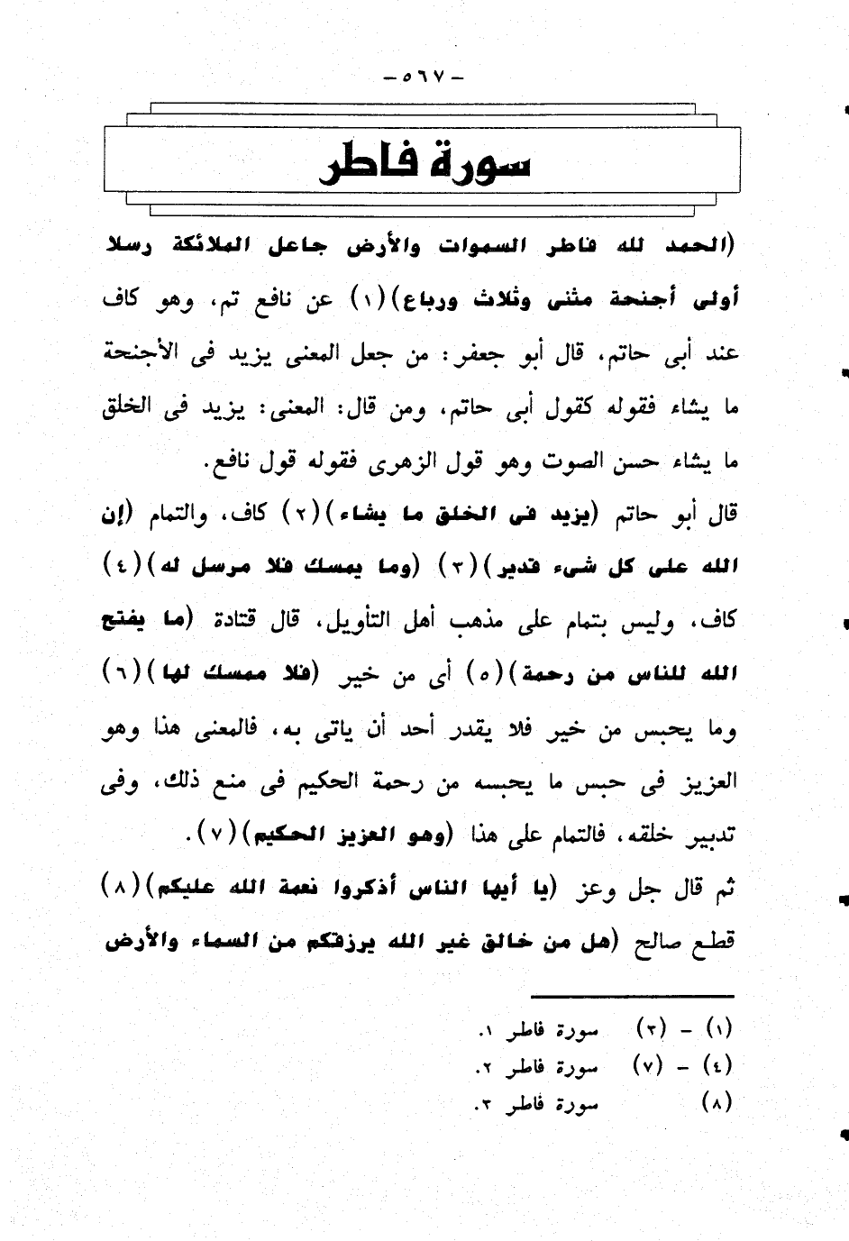 {الحمد لله فاطر السموات والأرض جاعل الملائكة رسلا أولى أجنحة مثنى وثلاث ورباع} عن نافع تم، وهو كاف عند أبي حاتم، قال أبو جعفر: من جعل المعنى يزيد في الأجنحة ما يشاء فقوله كقول أبي حاتم، ومن قال: المعنى: يزيد في الخلق ما يشاء حسن الصوت وهو قول الزهري فقوله قول نافع.