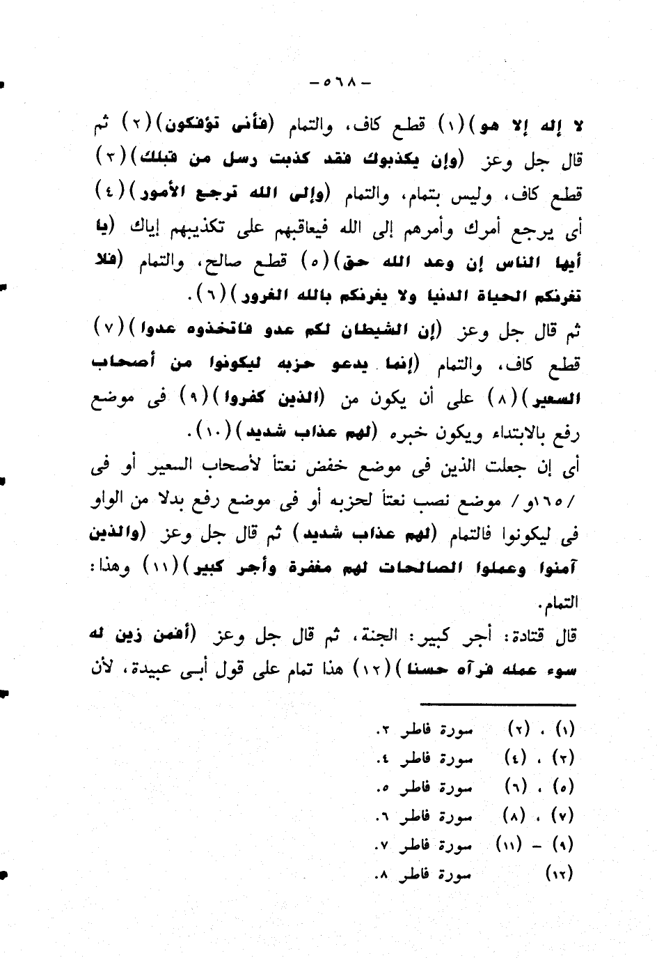 لا إله إلا الله} قطع كاف، والتمام {فأني تؤفكون} ثم قال جل وعز {وإن يكذبوك فقد كذبت رسل من قبلك} قطع كاف، وليس بتمام، والتمام {وإلى الله ترجع الأمور} أي يرجع أمرك وأمرهم إلى الله فيعاقبهم على تكذيبهم إياك {يا أيها الناس إن وعد الله حق} قطع صالح، والتمام {فلا تغرنكم الحياة الدنيا ولا يغرنكم بالله الغرور}.