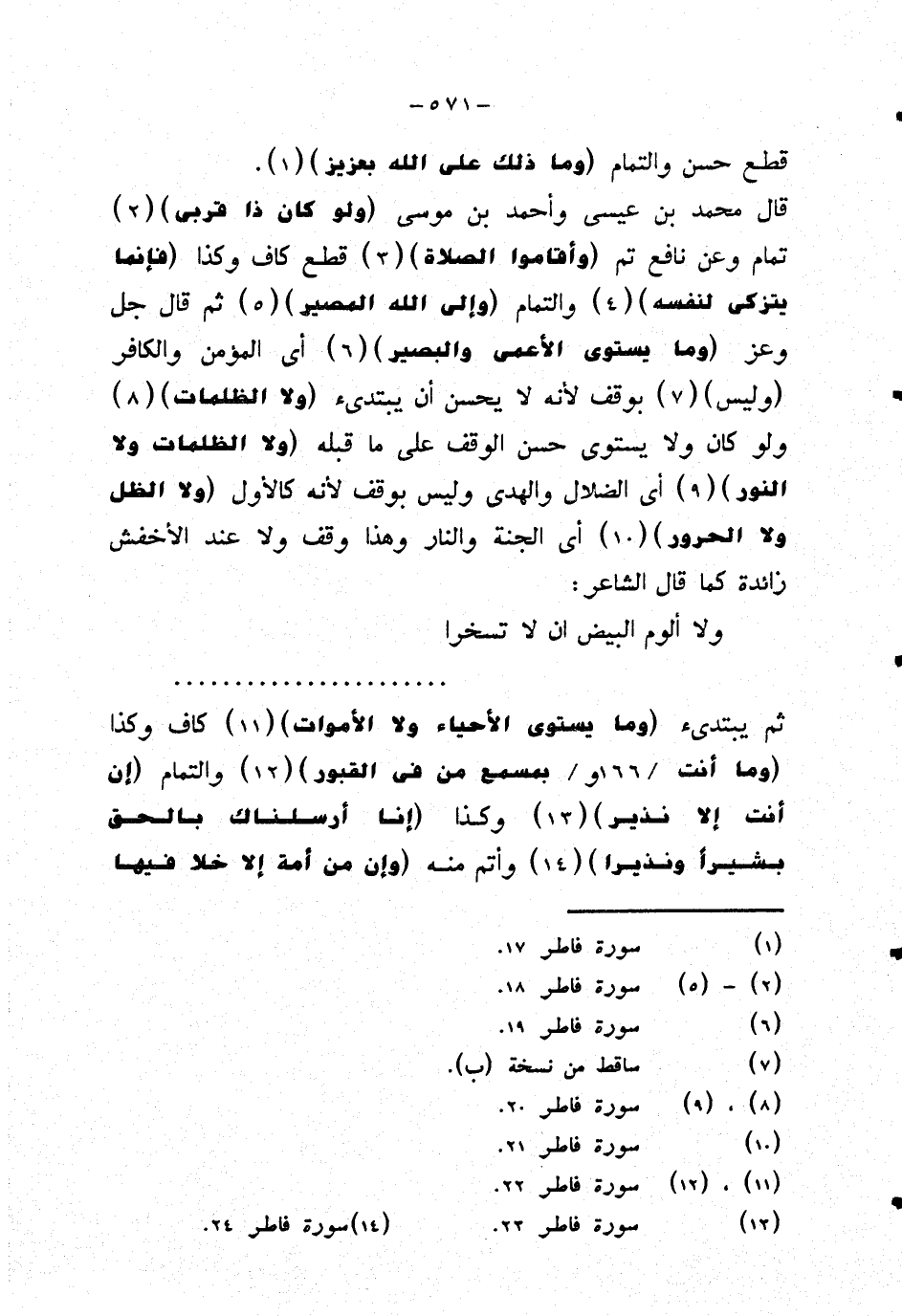 قال محمد بن عيسى وأحمد بن موسى {ولو كان ذا قربي} تمام وعن نافع تم {وأقاموا الصلاة} قطع كاف وكذا {فإنما يتزكى لنفسه} والتمام {وإلى الله المصير} ثم قال جل وعز {وما يستوي الأعمي والبصير} أي المؤمن والكافر {وليس} بوقف لأنه لا يحسن أن يتبديء {ولا الظلمات} ولو كان ولا يستوي حسن الوقف على ما قبله {ولا الظلمات ولا النور} أي الضلال والهدي وليس بوقف لأنه كالأول {ولا الظل ولا الحرور} أي الجنة والنار وهذا وقف ولا عند الأخفش زائدة كما قال الشاعر: