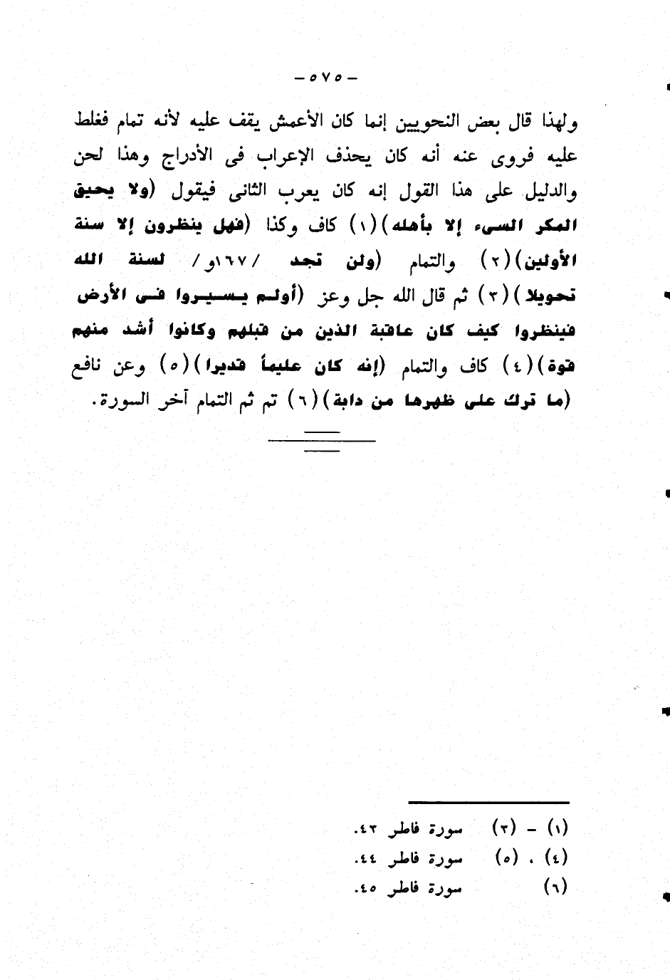 ولهذا قال بعض النحويين إنما كان الأعمش يقف عليه لأنه تمام فغلط عليه فروي عنه أنه كان يحذف الإعراب في الأدراج وهذا لحن والدليل على هذا القول إنه كان يعرب الثاني فيقول {ولا يحيق المكر السيء إلا بأهله} كاف وكذا {فهل ينظرون إلا سنة الأولين} والتمام {ولن تجد لسنة الله تحويلا} ثم قال الله جل وعز {أولم يسيروا في الأرض فينظروا كيف كان عاقبة الذين من قبلهم وكانوا أشد منهم قوة} كاف والتمام {إنه ان عليما قديرا} وعن نافع {ما ترك على ظهرها من دابة} تم ثم التمام آخر السورة.