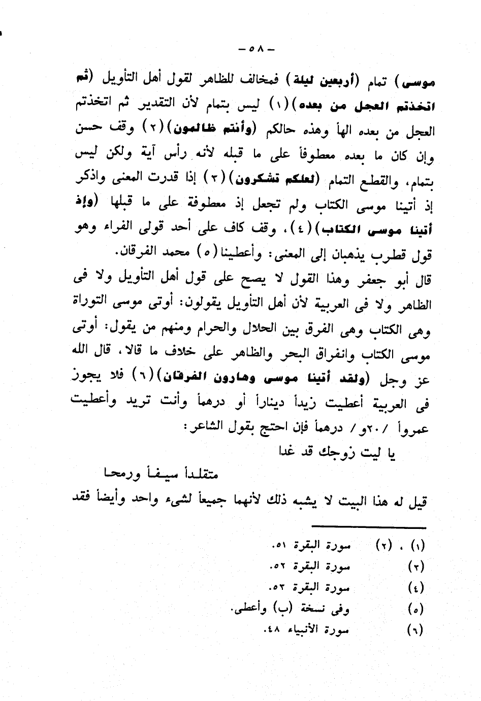 قال أبو جعفر وهذا القول لا يصح على قول أهل التأويل ولا في الظاهر ولا في العربية لأن أهل التأويل يقولون: أوتي موسى التوراة وهي الكتاب وهي الفرق بين الحلال والحرام ومنهم من يقول: أوتي موسى الكتاب وانفراق البحر والظاهر على خلاف ما قالا، قال الله عز وجل {ولقد أتينا موسى وهارون الفرقان} فلا يجوز في العربية أعطيت زيدًا دينارًا أو درهمًا وأنت تريد وأعطيت عمروًا درهمًا فإن احتج بقول الشاعر: