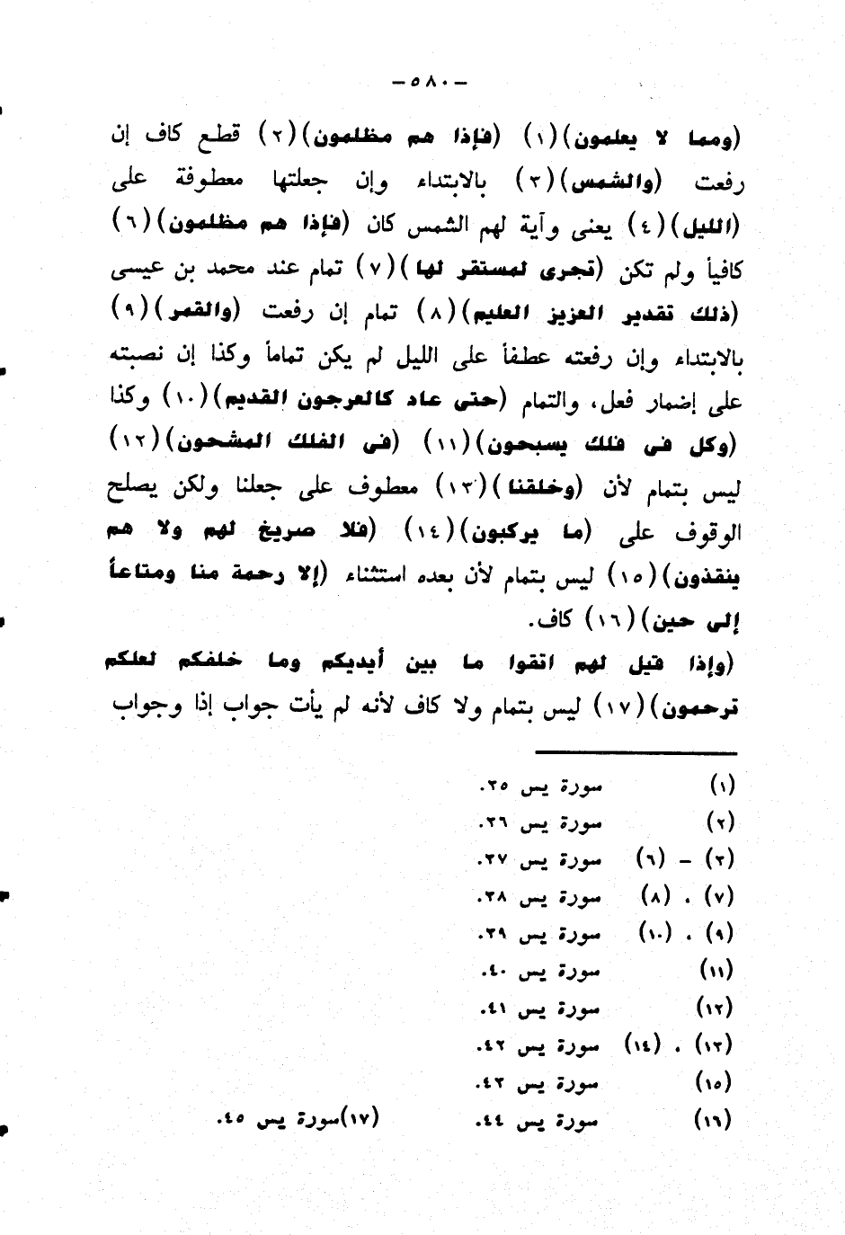 {ومما لا يعلمون} {فإذا هم مظلمون} قطع كاف إن رفعت {والشمس} بالابتداء وإن جعلتها معطوفة على {الليل} يعني وآية لهم الشمس كان {فإذا هم مظلمون} كافيا ولم تكن {تجري لمستقر لها} تمام عند محمد بن عيسى {ذلك تقدير العزيز العليم} تمام إن رفعت {والقمر} بالابتداء وإن رفعته عطفا على الليل لم يكن تماما وكذا إن نصبته على إضمار فعل، والتمام {حتى عاد كالعرجون القديم} وكذا {وكل في فلك يسبحون} {في الفلك المشحون} ليس بتمام لأن {وخلقنا} معطوف على جعلنا ولكن يصلح الوقوف على {ما يركبون} {فلا صريخ لهم ولا هم ينقذون} ليس بتمام لأن بعده استثناء {إلا رحمة منا ومتاعًا إلى حين} كاف.