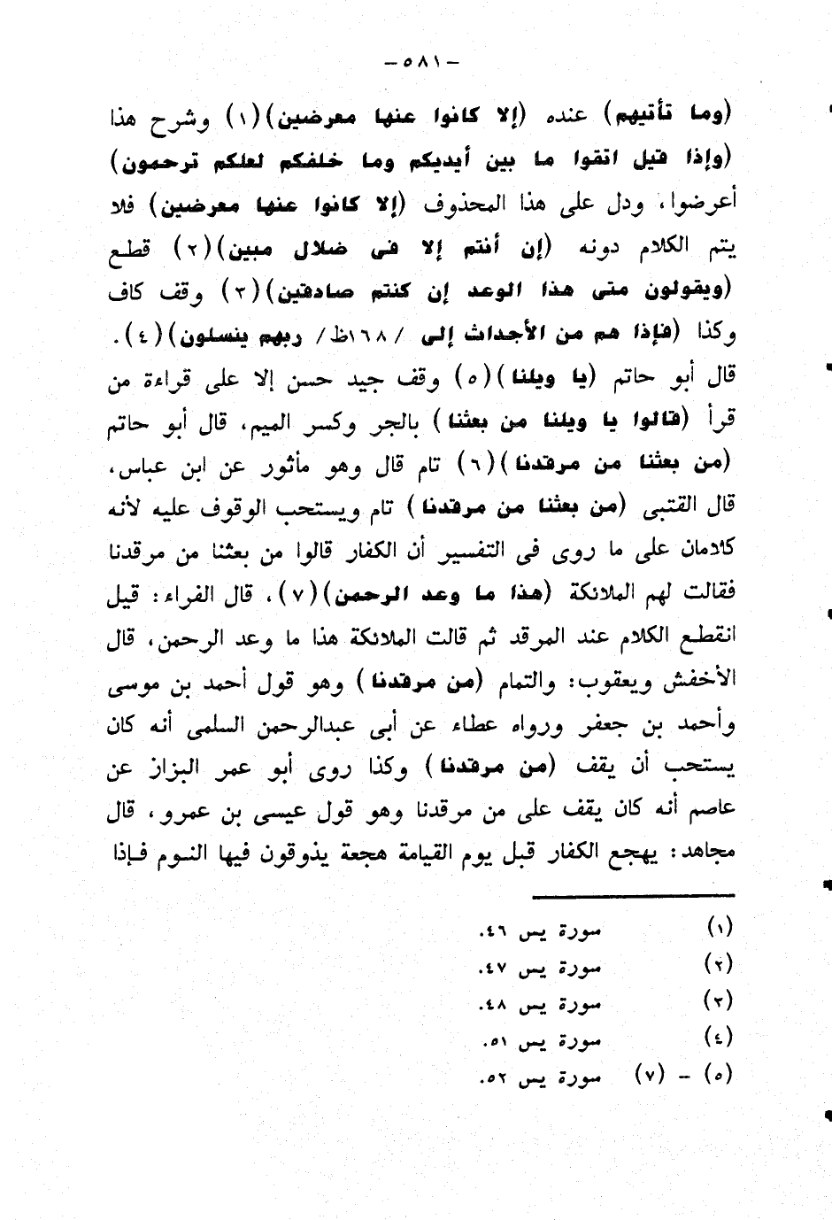 {وما تأتيهم} عنده {إلا كانوا عنها معرضين} وشرح هذا {وإذا قيل اتقوا ما بين أيديكم وما خلفكم لعلكم ترحمون} أعرضوا، ودل على هذا المحذوف {إلا كانوا عنها معرضين} فلا يتم الكلام دونه {إن أنتم إلا في ضلال مبين} قطع {ويقولون متى هذا الوعد إن كنتم صادقين} وقف كاف وكذا {فإذا هم من الأجداث إلى ربهم ينسلون} قال أبو حاتم {يا ويلنا} وقف جيد حسن إلا على قراءة من قرأ {قالوا يا ويلنا من بعثنا} بالجر وكسر الميم، قال أبو حاتم {من بعثنا من مرقدنا} تام قال وهو مأثور عن ابن عباس، قال القتبي {من بعثنا من مرقدنا} تام ويستحب الوقوف عليه لأنه كلامان على ما روى في التفسير أن الكفار قالوا من بعثنا من مرقدنا فقالت لهم الملائكة {هذا ما وعد الرحمن} قال الفراء: قيل انقطع الكلام عند المرقد ثم قالت الملائكة هنا ما وعد الرحمن، قال الأخفش ويعقوب: والتمام {من مرقدنا} وهو قول أحمد بن موسى وأحمد بن جعفر ورواه عطاء عن أبي عبد الرحمن السلمي أنه كان يستحب أن يقف {من مرقدنا} وكذا روي أبو عمر البزاز عن عاصم أنه كان يقف على من مرقدنا وهو قول عيسى بن عمرو، قال مجاهد: يهجع الكفار قبل يوم القيامة هجعة يذوقون فيها النوم فإذا