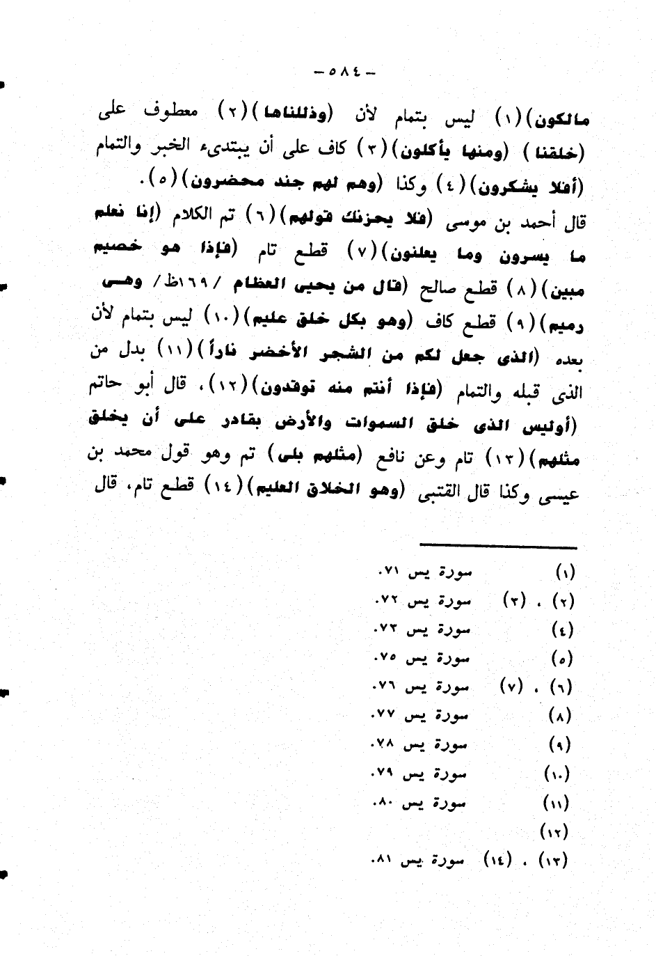 قال أحمد بن موسى {فلا يحزنك قولهم} تم الكلام {إنا نعلم ما يسون وما يعلنون} قطع تام {فإذا هو خصيم مبين} قطع صالح {قال من يحيى العظام وهي رميم} قطع كاف {وهو بكل خلق عليم} ليس بتمام لأن بعده {الذي جعل لكم من الشجر الأخضر نارا} بدل من الذي قبله والتمام {فإذا أنتم منه توقدون} قال أبو حاتم {أوليس الذي خلق السموات والأرض بقادر على ان يخلق مثلهم} تام وعن نافع {مثلهم بلى} تم وهو قول محمد بن عيسى وكذا قال القتبي {وهو الخلاق العليم} قطع تام، قال