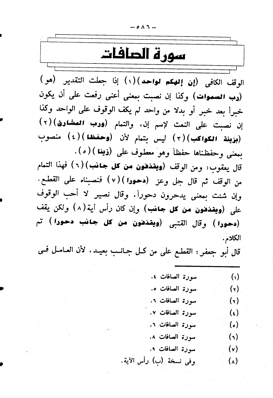 الوقف الكافي {إن إلهكم لواحد} إذا جعلت التقدير {هو} {رب السموات} وكذا إن نصبت بمعنى أعني رفعت على أن يكون خبرا بعد خبر أو بدلا من واحد لم يكف الوقوف على الواحد وكذا إن نصبت على النعت لإسم إن، والتمام {ورب المشارق} {بزينة الكواكب} ليس بتمام لأن {وحفظا} منصوب بمعنى وحفظناها حفظا وهو معطوف على {زينا}.