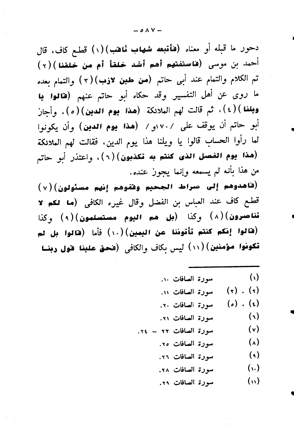 دحور ما قبله أو معناه {فأتبعه شهاب ثاقب} قطع كاف، قال أحمد بن موسى {فاستفتهم أهم أشد خلقا أم من خلقنا} تم الكلام والتمام عند أبي حاتم {من طين لازب} والتمام بعده ما روى عن أهل التفسير وقد حكاه ابو حاتم عنهم {قالوا يا ويلنا} ثم قالت لهم الملائكة {هذا يوم الدين} وأجاز أبو حاتم أن يوقف على {هذا يوم الدين} وأن يكونوا لما رأوا الحساب قالوا يا ويلنا هذا يوم الدين، فقالت لهم الملائكة {هذا يوم الفصل الذي كنتم به تكذبون} واعتذر أبو حاتم من هذا بأنه لم يسمعه وإنما يجوز عنده.