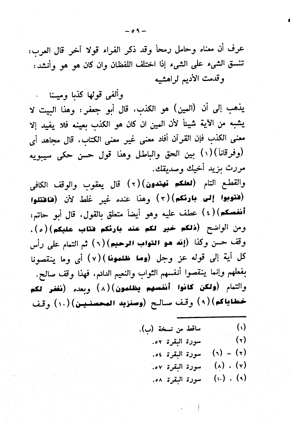 يذهب إلى أن (المين) هو الكذب، قال أبو جعفر: وهذا البيت لا يشبه من الآية شيئًا لأن المين إن كان هو الكذب بعينه فلا يفيد إلا معنى الكذب فإن القرآن أفاد معنى غير معنى الكتاب، قال مجاهد أي {وفرقانا} بين الحق والباطل وهذا قول حسن حكى سيبويه مررت بزيد أخيك وصديقك.