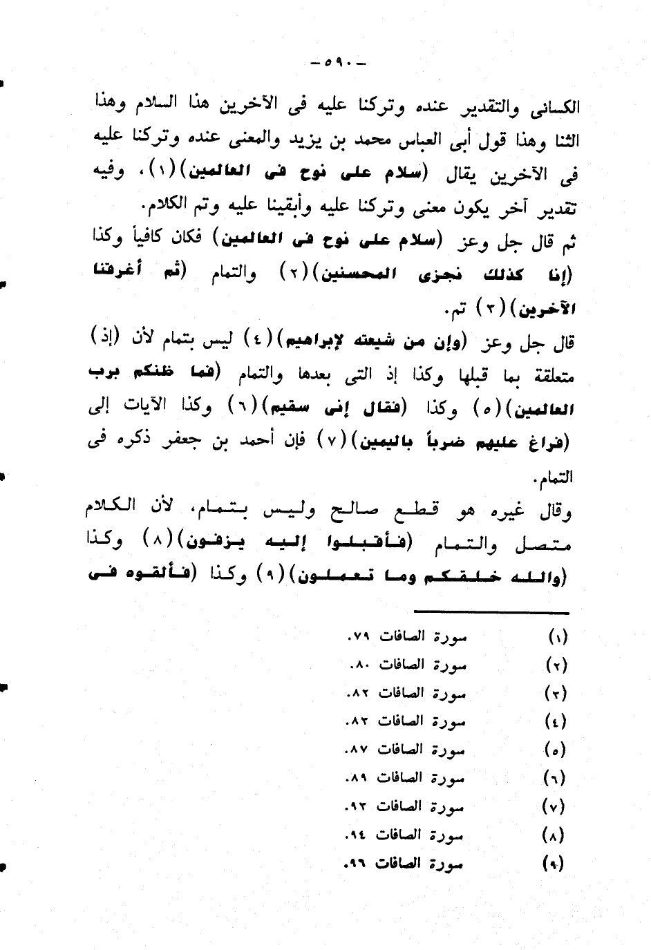 ثم قال جل وعز {سلام على نوح في العالمين} فكان كافيا وكذا {إنا كذلك نجزي المحسنين} والتمام {ثم أغرقنا الآخرين} تم.
