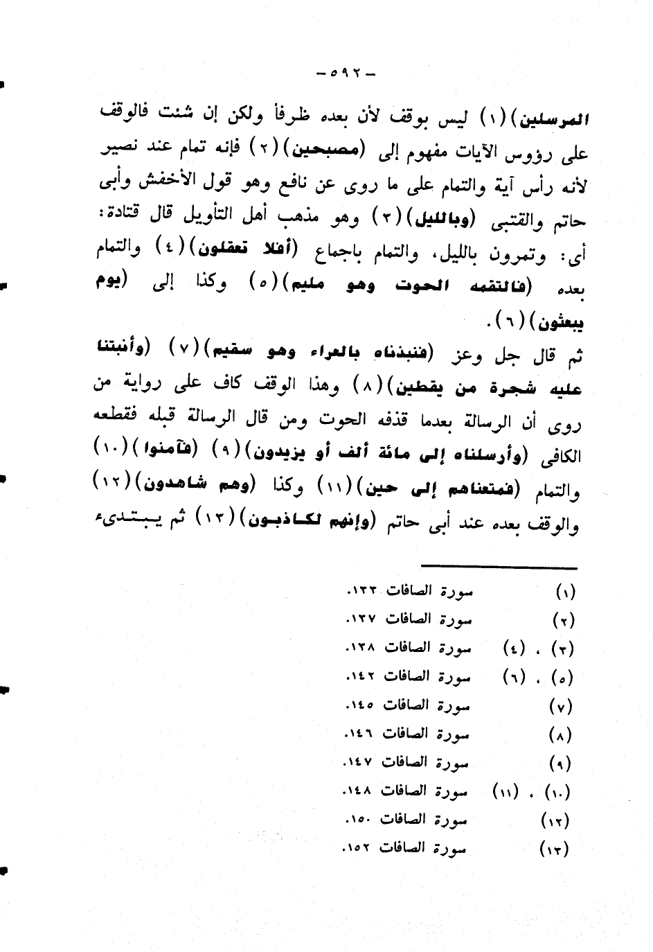 ثم قال جل وعز {فنبذناه بالعراء وهو سقيم} {وأنبتنا عليه شجرة من يقطين} وهذا الوقف كاف على رواية من روى أن الرسالة بعدما قذفه الحوت ومن قال الرسال قبله فقطعه الكافي {وأرسلناه إلى مائة ألف أو يزيدون} {فآمنوا} والتمام {فمتعناهم إلى حين} وكذا {وهم شاهدون} والوقف بعده عند أبي حاتم {وإنهم لكاذبون} ثم يبتديء