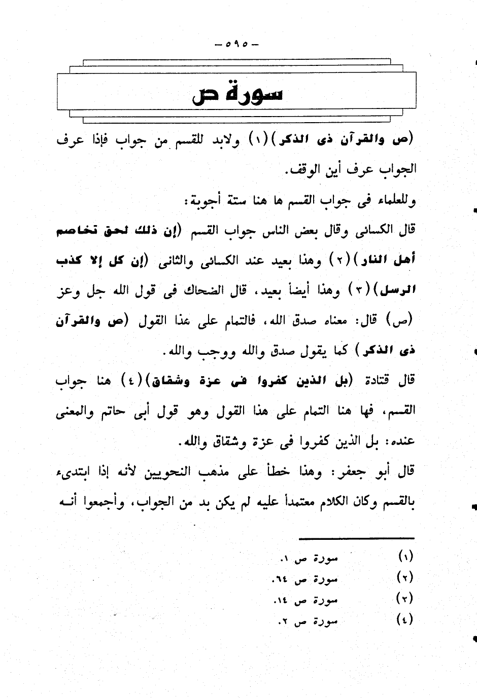قال الكسائي وقال بعض الناس جواب القسم {إن ذلك لحق تخاصم أهل النار} وهذا بعيد عند الكسائي والثاني {إن كل إلا كذب الرسل} وهذا أيضا بعيد، قال الضحاك في قول الله جل وعز (ص) قال: معناه صدق الله، فالتمام على هذا القول {ص والقرآن ذي الذكر} كما يقول صدق والله ووجب والله.