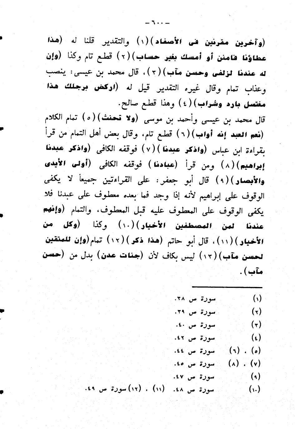 {وأخرين مقرنين في الأصفاد} والتقدير قلنا له {هذا عطاؤنا فامنن أو أمسك بغير حساب} قطع تام وكذا {وإن له عندنا لزلفى وحسن مآب} قال محمد بن عيسى: ينصب وعذاب تمام وقال غيره التقدير قيل له {اركض برجلك هذا مغتسل بارد وشراب} وهذا قطع صالح.