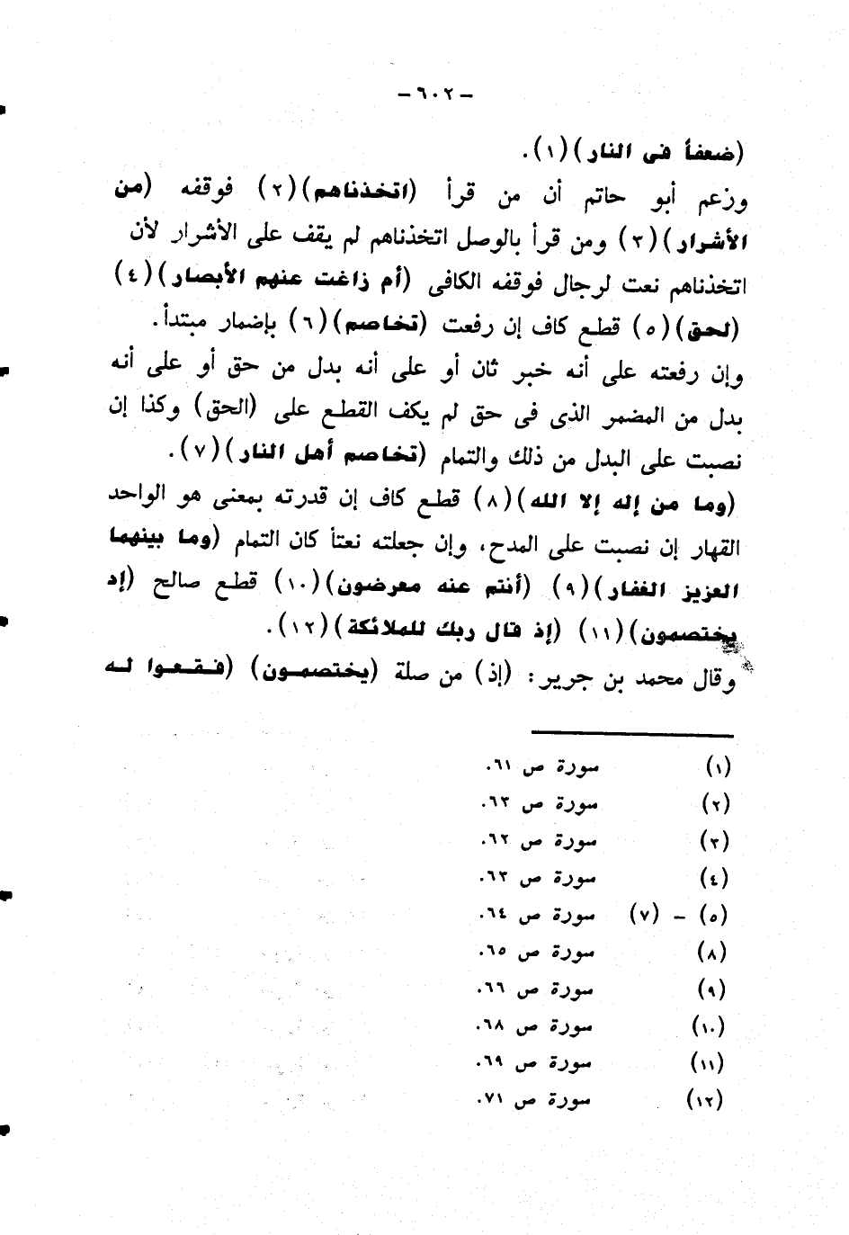 وزعم أبو حاتم أن من قرأ {اتخذناهم} فوقفه {من الأشرار} ومن قرأ بالوصول اتخذناهم لم يقف على الأشرار لأن اتخذناهم نعت لرجال فوقفه الكافي {أم زاغت عنهم الأبصار} {لحق} قطع كاف إن رفعت {تخاصم} بإضمار مبتدأ.