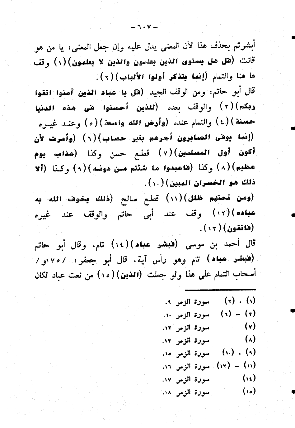 قال أبو حاتم: ومن الوقف الجيد {قل يا عباد الذين آمنوا ربكم} والوقف بعده {للذين أحسنوا في هذه الدنيا حسنة} والتمام عنده {وأرض الله واسعة} وعند غيره {إنما يوفي الصابرون أجرهم بغير حساب} {وأمرت لأن أكون أول المسلمين} قطع حسن وكذا {عذاب يوم عظيم} وكذا {فاعبدوا ما شئتم من دونه} وكذا {ألا ذلك هو الخسران المبين}.
