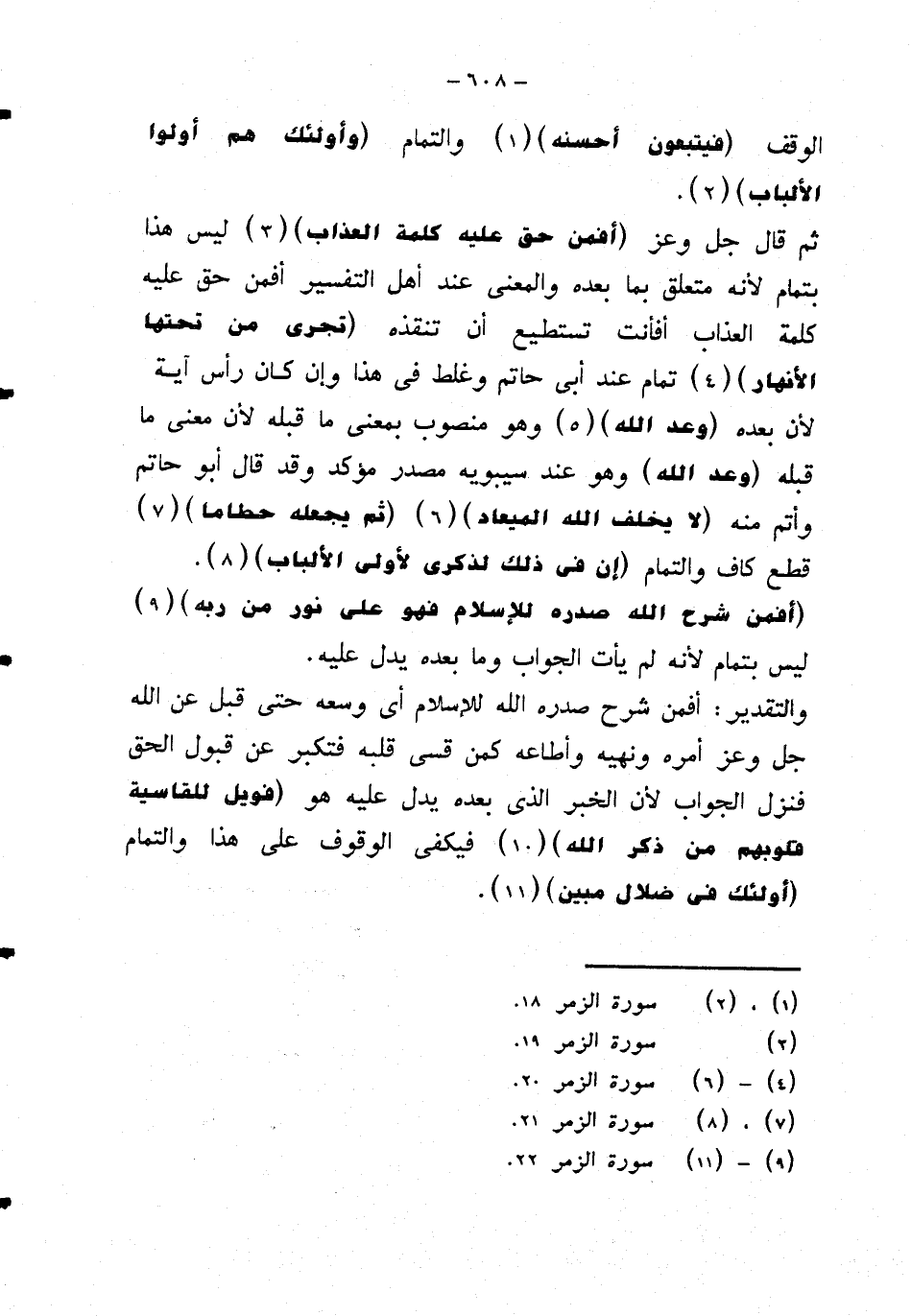 ثم قال جل وعز {أفمن حق عليه كلمة العذاب} ليس هذا بتمام لأنه متعلق بما بعده والمعنى عند أهل التفسير أفمن حق عليه كلمة العذاب أفأنت تستطيع أن تنقذه {تجري من تحتها الأنهار} تمام عند أبي حاتم وغلط في هذا وإن كان رأس آية لأن بعده {وعد الله} وهو منصوب بمعنى ما قبله لأن معنى ما قبله {وعد الله} وهو عند سيبويه مصدر مؤكد وقد قال أبو حاتم وأتم منه {لا يخلف الله الميعاد} {ثم يجعله حطاما} قطع كاف والتمام {إن في ذلك لذكرى لأولى الألباب}. {افمن شرح الله صدره للإسلام فهو على نور من ربه} ليس بتمام لم يأت الجواب وما بعده يدل عليه.